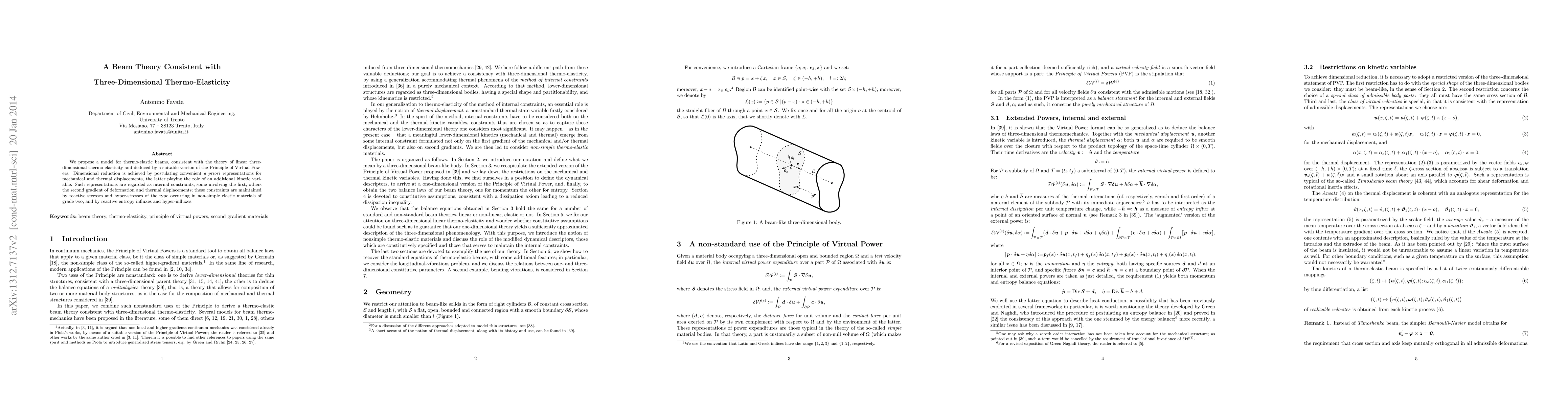 This paper proposes a beam theory that combines linear three-dimensional thermo-elasticity with additional thermal displacements as an internal constraint, leading to a consistent model.