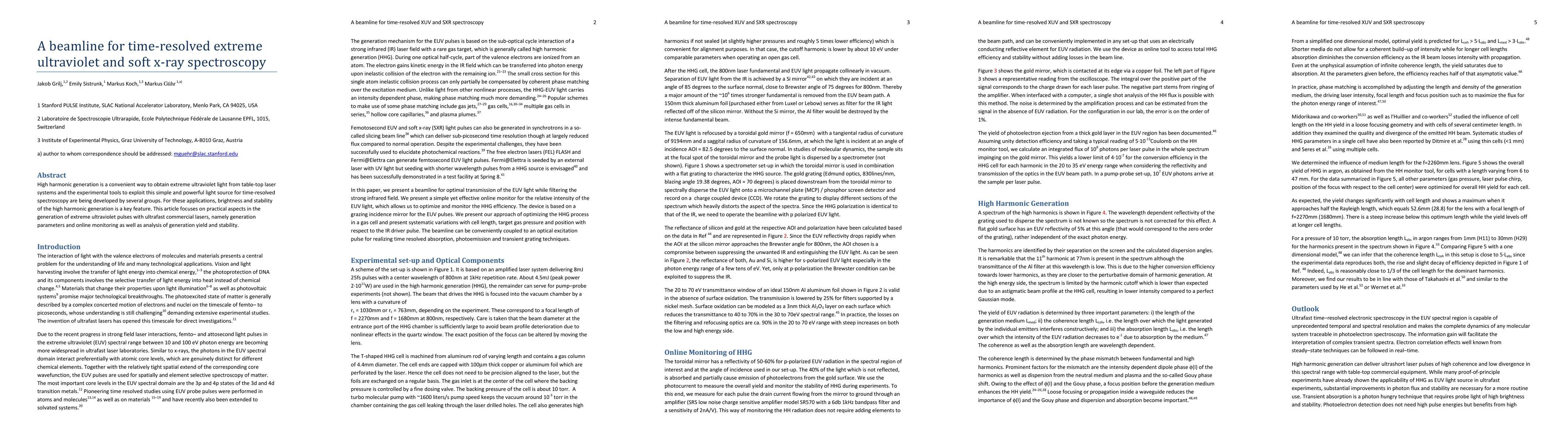 This paper discusses the development of a beamline for time-resolved spectroscopy using high harmonic generation from ultrafast commercial lasers to produce stable extreme ultraviolet pulses, focusing on generation parameters and online monitoring techniques.