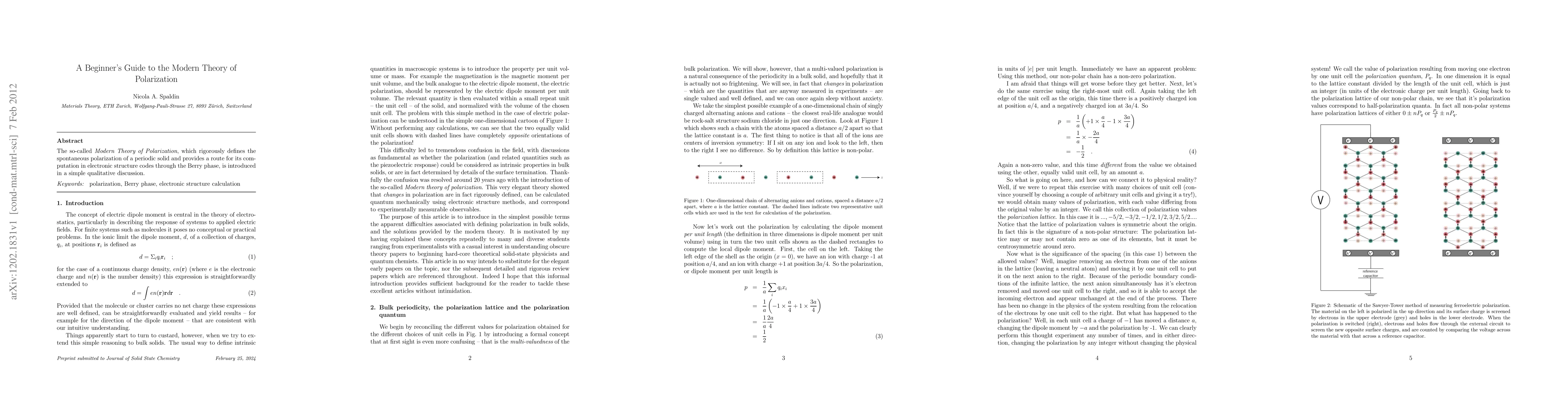 The so-called {\it Modern Theory of Polarization}, which rigorously defines the spontaneous polarization of a period solid and provides a route for its computation in electronic structure codes through the Berry phase, is introduced in a simple qualitative discussion.