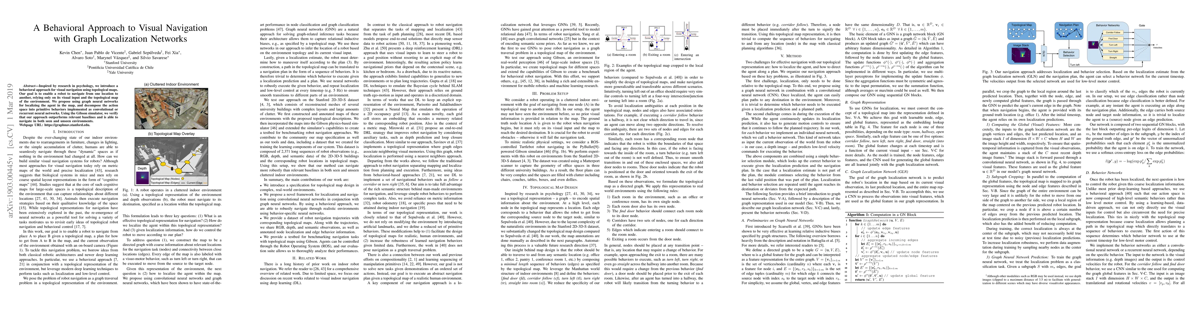 Inspired by research in psychology, we introduce a behavioral approach for visual navigation using topological maps. Our goal is to enable a robot to navigate from one location to another, relying only on its visual input and the topological map of the environment. We propose using graph neural networks for localizing the agent in the map, and decompose the action space into primitive behaviors implemented as convolutional or recurrent neural networks. Using the Gibson simulator, we verify that our approach outperforms relevant baselines and is able to navigate in both seen and unseen environments.