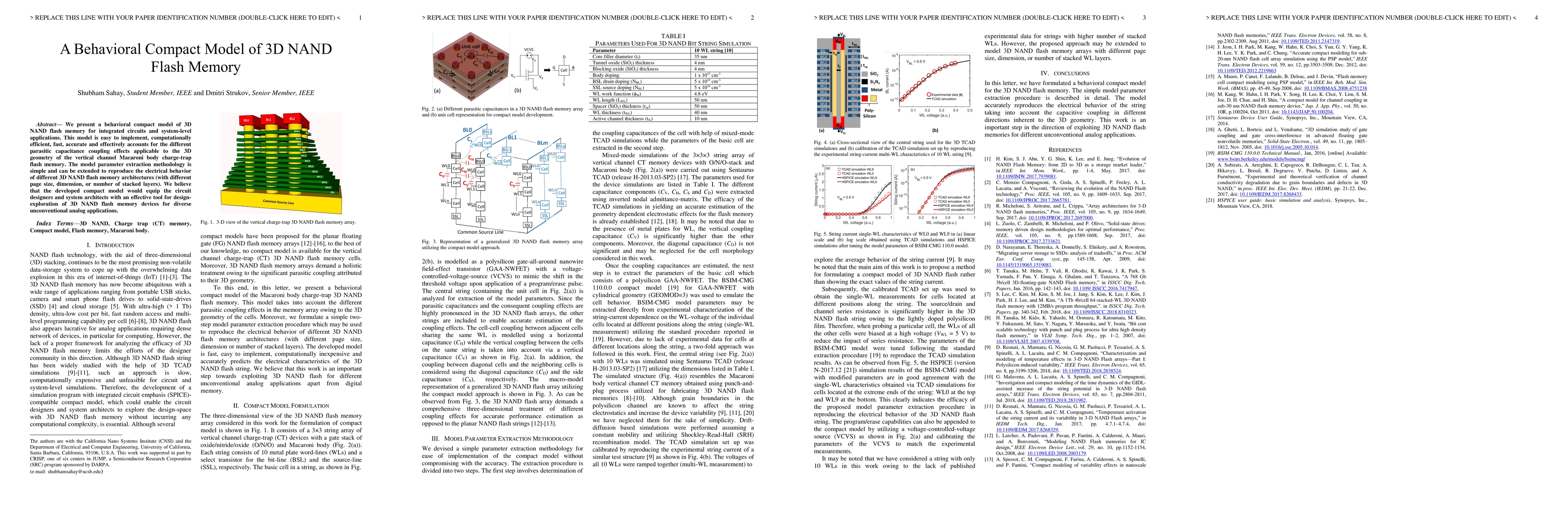 This paper introduces a behavioral compact model for 3D NAND flash memory, emphasizing its simplicity, computational efficiency, and accuracy in capturing parasitic capacitance effects. The model's parameter extraction is straightforward, making it adaptable to various 3D NAND architectures, thus aiding circuit designers and system architects in exploring unconventional analog applications.