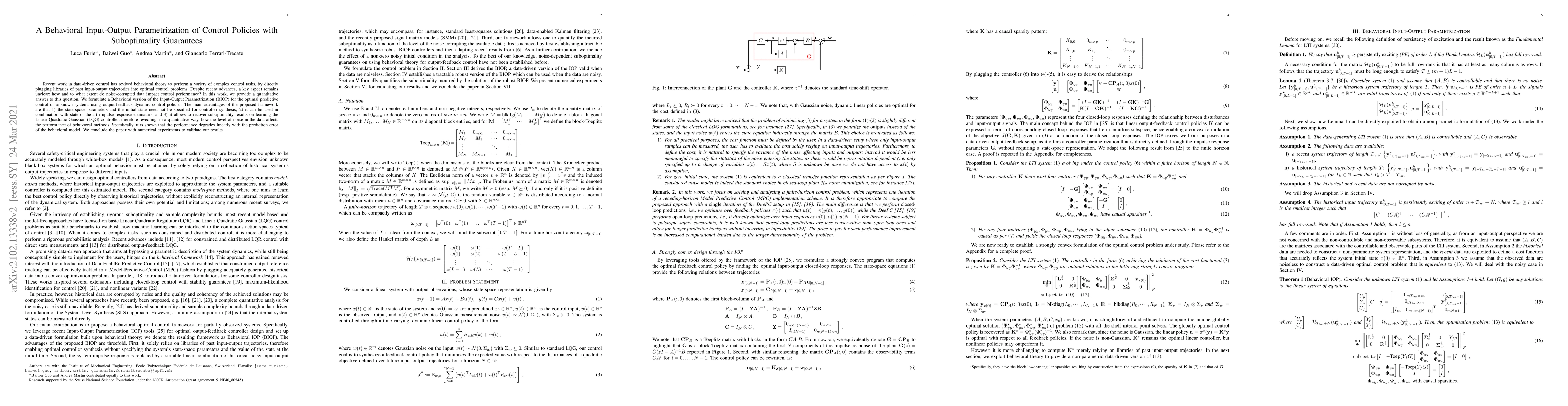 This paper introduces a Behavioral Input-Output Parametrization (BIOP) framework for optimal predictive control, demonstrating how noise in data impacts control performance. It reveals that performance degrades linearly with the prediction error, providing quantitative insights into suboptimality guarantees.