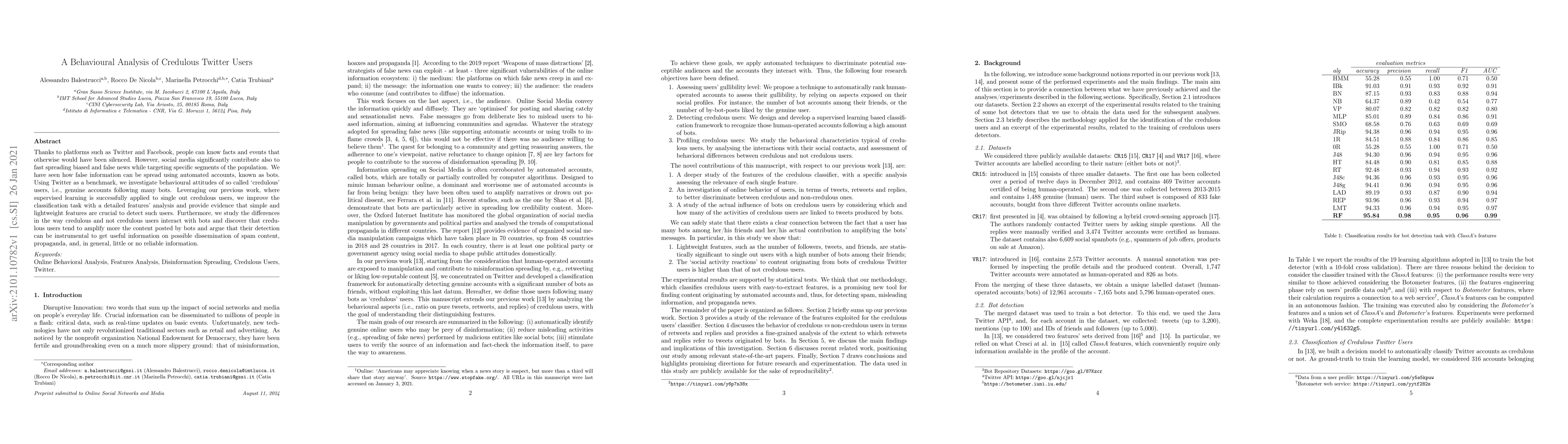 This study analyzes Twitter users who spread false information, known as credulous users, and finds that they tend to amplify bot content. Researchers propose using this detection to filter out unreliable information on social media platforms.