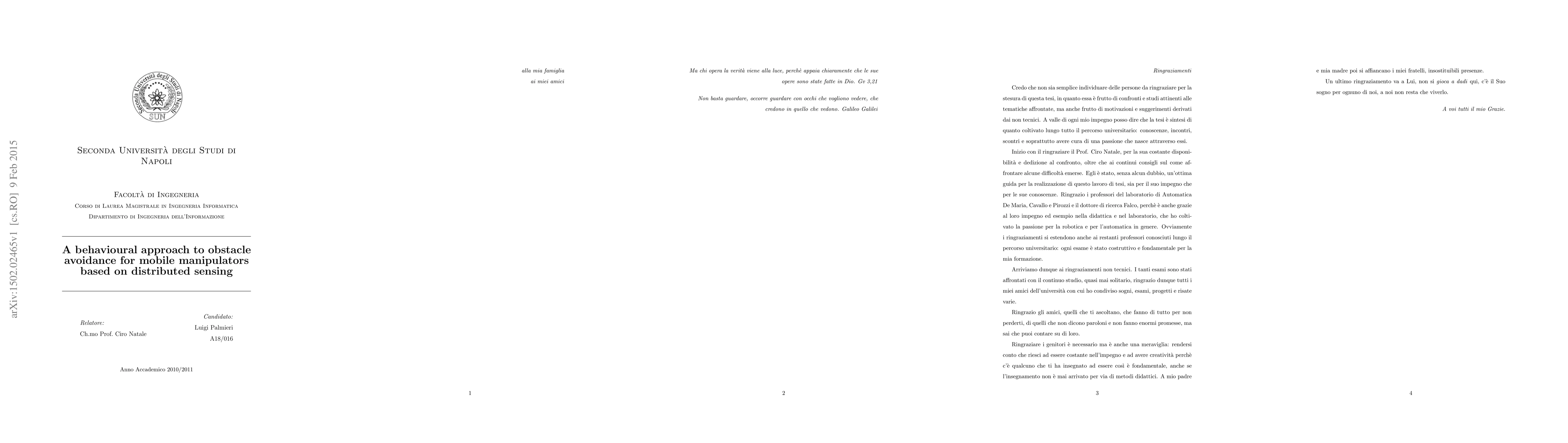 A reactive obstacle avoidance method for mobile manipulators is presented. The objectives of the developed algorithm are twofold. The first one is to find a trajectory in the configuration space of a mobile manipulator so as to follow a given trajectory in the task space. The second objective consists in locally adjusting the trajectory in the configuration space in order to avoid collisions with potentially moving obstacles and self-collisions in unstructured and dynamic environments. The perception is exclusively based on a set of proximity sensors distributed on the robot mechanical structure and visual information are not required. Thanks to the adoption of this kind of proximity distributed perception, the approach does not require a 3D model of the robot and allows the real-time collision avoidance without the need of a sensorized environment. To achieve the features cited above, a behaviour-based technique known as Null-Space-Based (NSB) approach has been adopted with some modifications.On one hand, the concept of a total pseudo-energy based on the information from the distributed sensors has been introduced. On the other hand, a method to combine different tasks has been proposed to guarantee the smoothness of the realtime trajectory adjustments. Another significant feature of the method is the strict coordination between the base and the arm exploiting the redundant degrees of freedom, that is a relevant topic in mobile manipulation.