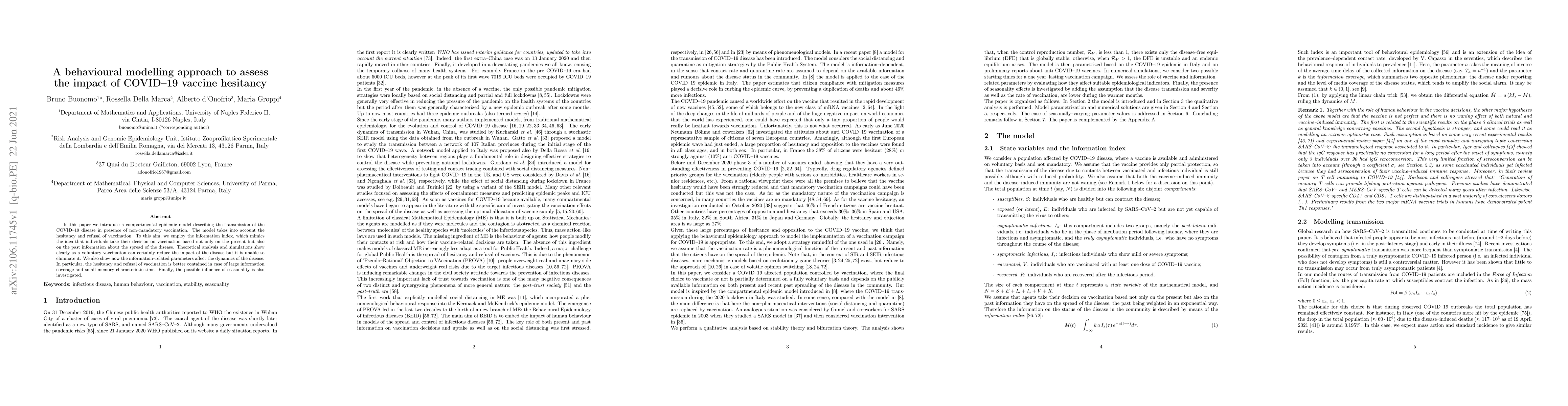 In this paper we introduce a compartmental epidemic model describing the transmission of the COVID-19 disease in presence of non-mandatory vaccination. The model takes into account the hesitancy and refusal of vaccination. To this aim, we employ the information index, which mimics the idea that individuals take their decision on vaccination based not only on the present but also on the past information about the spread of the disease. Theoretical analysis and simulations show clearly as a voluntary vaccination can certainly reduce the impact of the disease but it is unable to eliminate it. We also show how the information-related parameters affect the dynamics of the disease. In particular, the hesitancy and refusal of vaccination is better contained in case of large information coverage and small memory characteristic time. Finally, the possible influence of seasonality is also investigated.