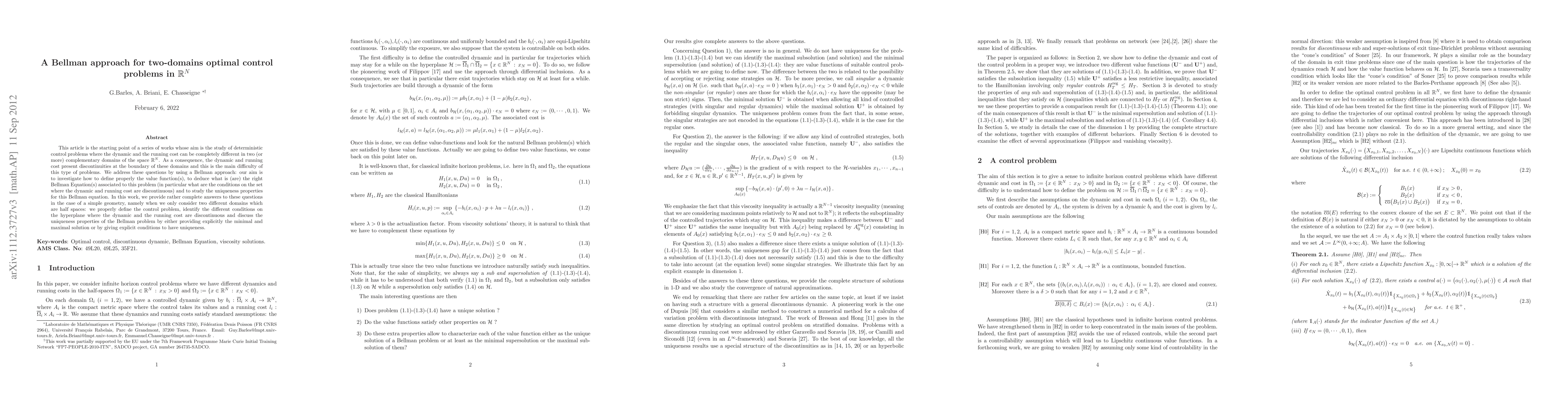 This article is the starting point of a series of works whose aim is the study of deterministic control problems where the dynamic and the running cost can be completely different in two (or more) complementary domains of the space $\R^N$. As a consequence, the dynamic and running cost present discontinuities at the boundary of these domains and this is the main difficulty of this type of problems. We address these questions by using a Bellman approach: our aim is to investigate how to define properly the value function(s), to deduce what is (are) the right Bellman Equation(s) associated to this problem (in particular what are the conditions on the set where the dynamic and running cost are discontinuous) and to study the uniqueness properties for this Bellman equation. In this work, we provide rather complete answers to these questions in the case of a simple geometry, namely when we only consider two different domains which are half spaces: we properly define the control problem, identify the different conditions on the hyperplane where the dynamic and the running cost are discontinuous and discuss the uniqueness properties of the Bellman problem by either providing explicitly the minimal and maximal solution or by giving explicit conditions to have uniqueness.