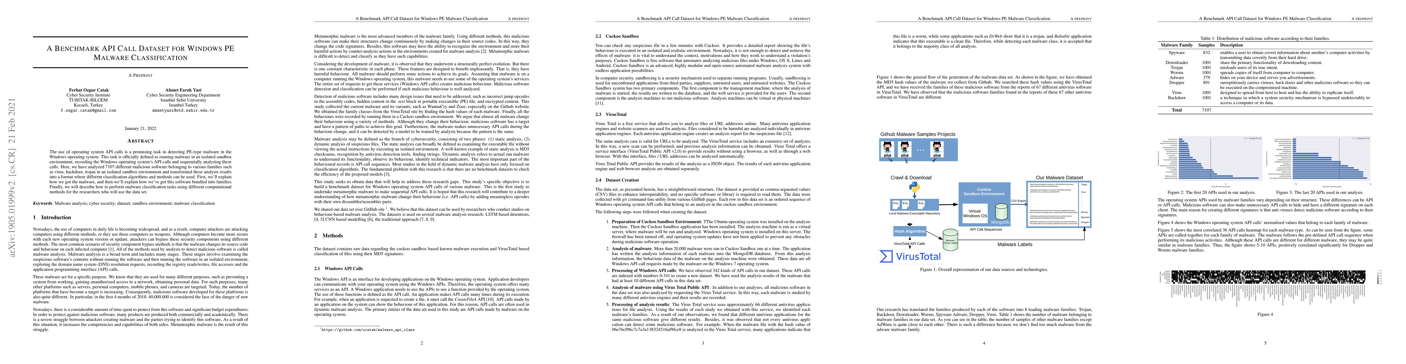 The use of operating system API calls is a promising task in the detection of PE-type malware in the Windows operating system. This task is officially defined as running malware in an isolated sandbox environment, recording the API calls made with the Windows operating system and sequentially analyzing these calls. Here, we have analyzed 7107 different malicious software belonging to various families such as virus, backdoor, trojan in an isolated sandbox environment and transformed these analysis results into a format where different classification algorithms and methods can be used. First, we'll explain how we got the malware, and then we'll explain how we've got these software bundled into families. Finally, we will describe how to perform malware classification tasks using different computational methods for the researchers who will use the data set we have created.