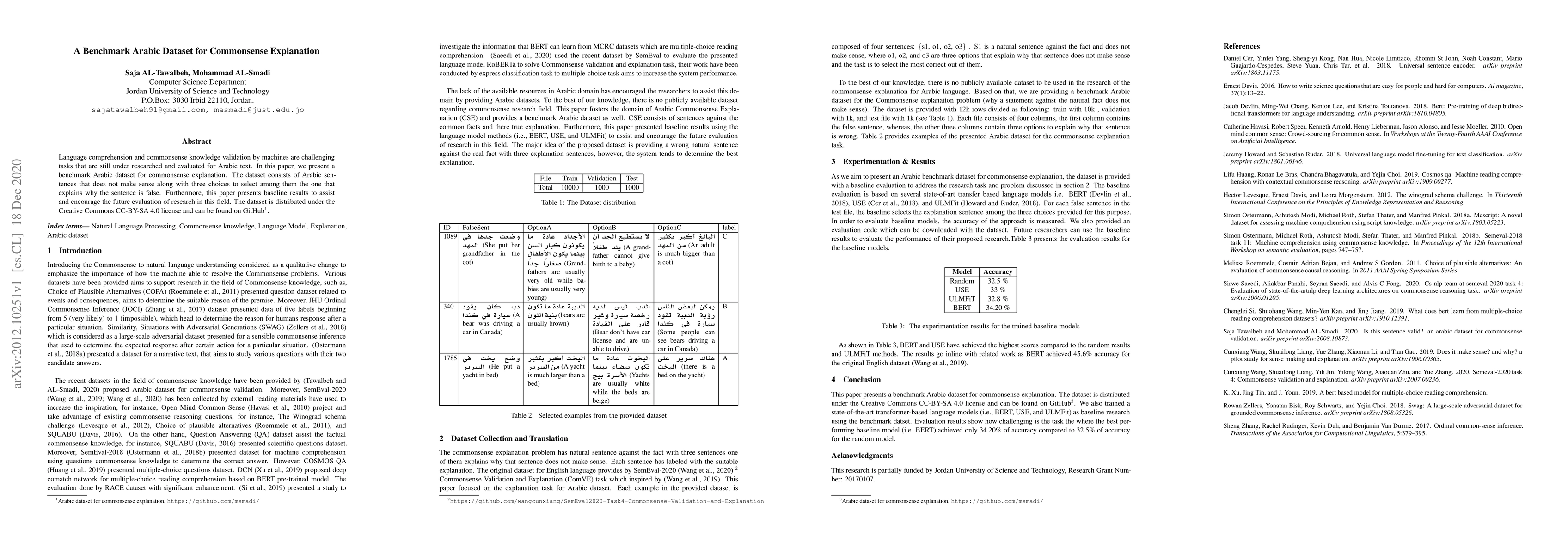 This paper introduces a benchmark dataset for evaluating commonsense explanation in Arabic, featuring nonsensical sentences with three explanatory choices. It aims to facilitate research in machine language comprehension and provides initial baseline results to spur further investigation.
