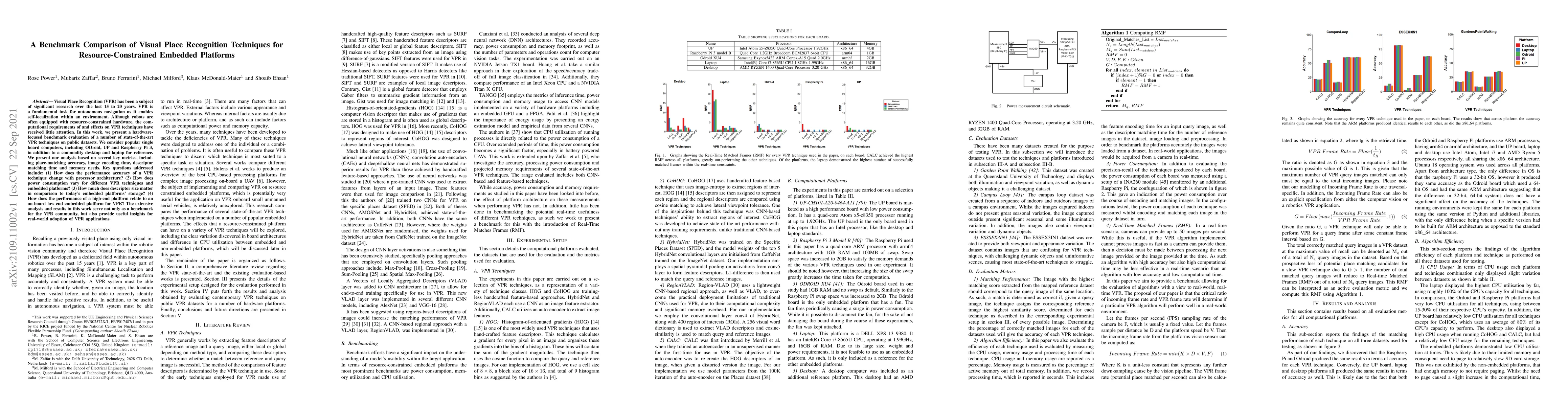 Visual Place Recognition (VPR) has been a subject of significant research over the last 15 to 20 years. VPR is a fundamental task for autonomous navigation as it enables self-localization within an environment. Although robots are often equipped with resource-constrained hardware, the computational requirements of and effects on VPR techniques have received little attention. In this work, we present a hardware-focused benchmark evaluation of a number of state-of-the-art VPR techniques on public datasets. We consider popular single board computers, including ODroid, UP and Raspberry Pi 3, in addition to a commodity desktop and laptop for reference. We present our analysis based on several key metrics, including place-matching accuracy, image encoding time, descriptor matching time and memory needs. Key questions addressed include: (1) How does the performance accuracy of a VPR technique change with processor architecture? (2) How does power consumption vary for different VPR techniques and embedded platforms? (3) How much does descriptor size matter in comparison to today's embedded platforms' storage? (4) How does the performance of a high-end platform relate to an on-board low-end embedded platform for VPR? The extensive analysis and results in this work serve not only as a benchmark for the VPR community, but also provide useful insights for real-world adoption of VPR applications.