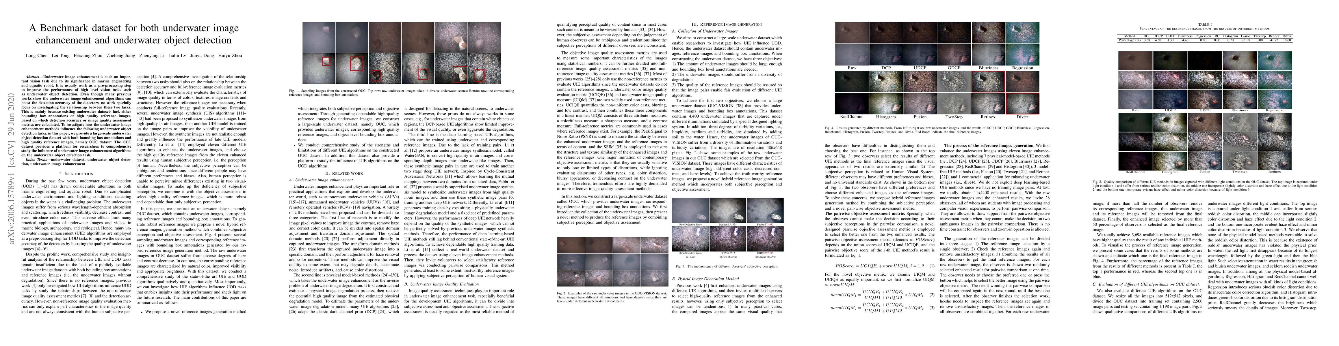 This paper introduces the OUC dataset, a comprehensive benchmark for both underwater image enhancement and object detection, featuring bounding box annotations and high-quality reference images. The dataset aims to facilitate research into how image enhancement methods impact underwater object detection performance.