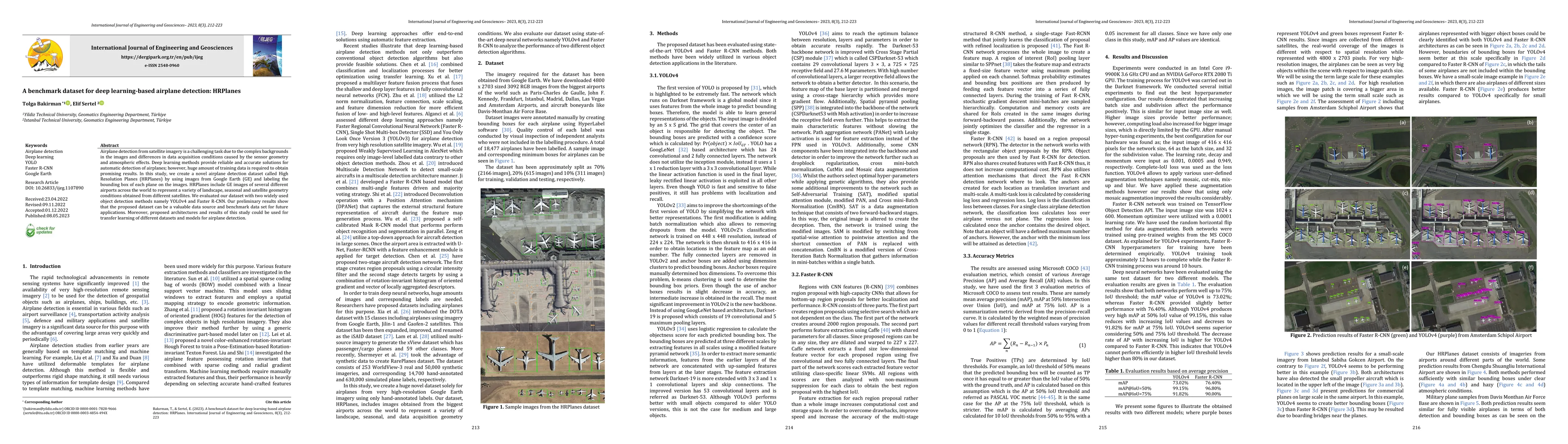 The HRPlanes dataset, created from Google Earth images, offers high-resolution airplane detection data with bounding boxes for various conditions. It was evaluated using YOLOv4 and Faster R-CNN, showing potential as a benchmark for future airplane detection research and transfer learning applications.