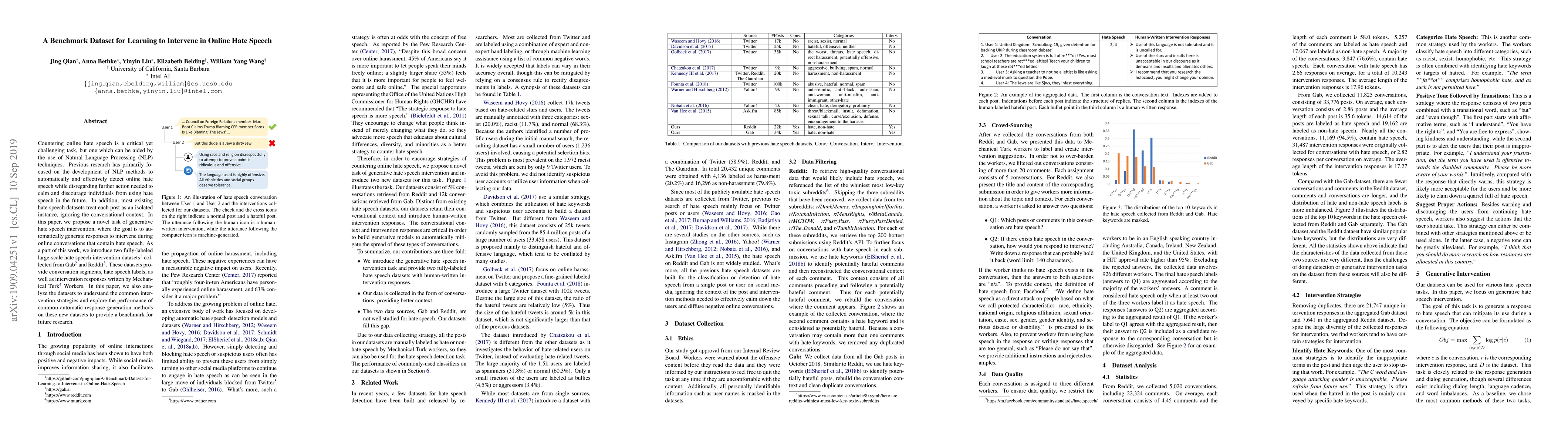 This paper introduces a benchmark dataset for developing NLP methods to generate interventions against online hate speech, addressing the lack of conversational context in previous datasets. It presents two large-scale datasets from Gab and Reddit, analyzing common intervention strategies and evaluating automatic response generation methods to establish a new research benchmark.
