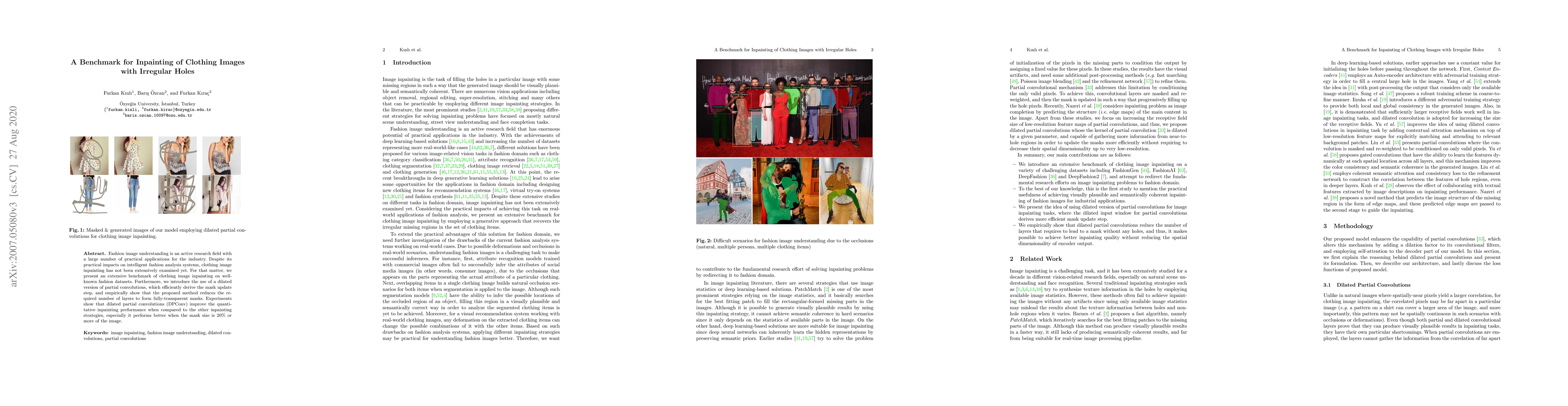 Fashion image understanding is an active research field with a large number of practical applications for the industry. Despite its practical impacts on intelligent fashion analysis systems, clothing image inpainting has not been extensively examined yet. For that matter, we present an extensive benchmark of clothing image inpainting on well-known fashion datasets. Furthermore, we introduce the use of a dilated version of partial convolutions, which efficiently derive the mask update step, and empirically show that the proposed method reduces the required number of layers to form fully-transparent masks. Experiments show that dilated partial convolutions (DPConv) improve the quantitative inpainting performance when compared to the other inpainting strategies, especially it performs better when the mask size is 20% or more of the image. \keywords{image inpainting, fashion image understanding, dilated convolutions, partial convolutions