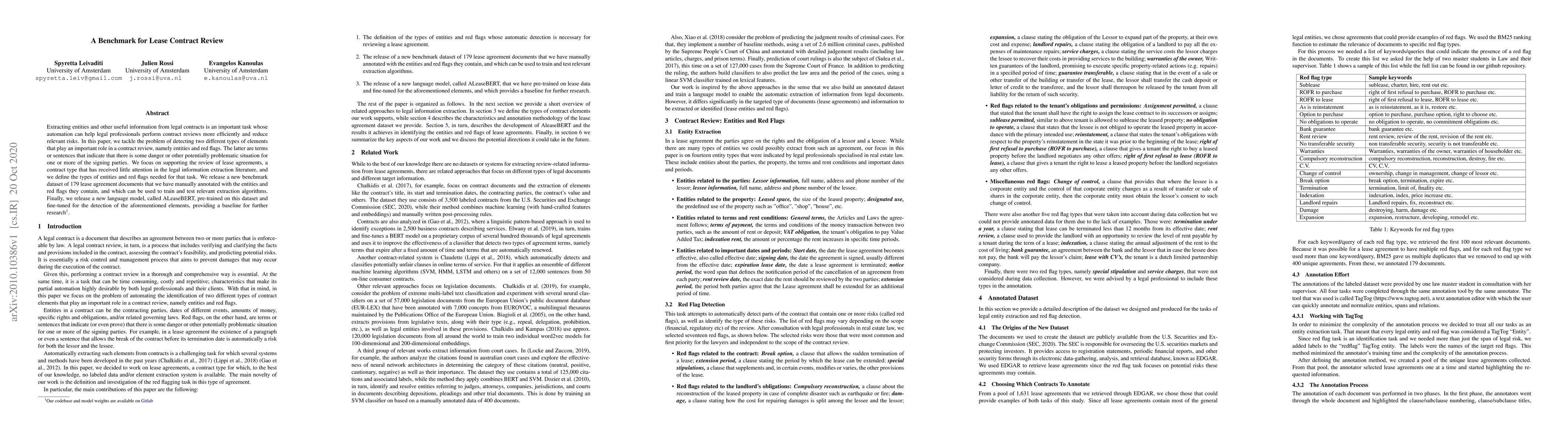 This paper introduces a benchmark dataset for automating the review of lease agreements by extracting entities and red flags, and presents ALeaseBERT, a pre-trained language model fine-tuned for this task, aiming to assist legal professionals in contract review. The dataset includes 179 manually annotated lease agreements to facilitate algorithm development and evaluation.
