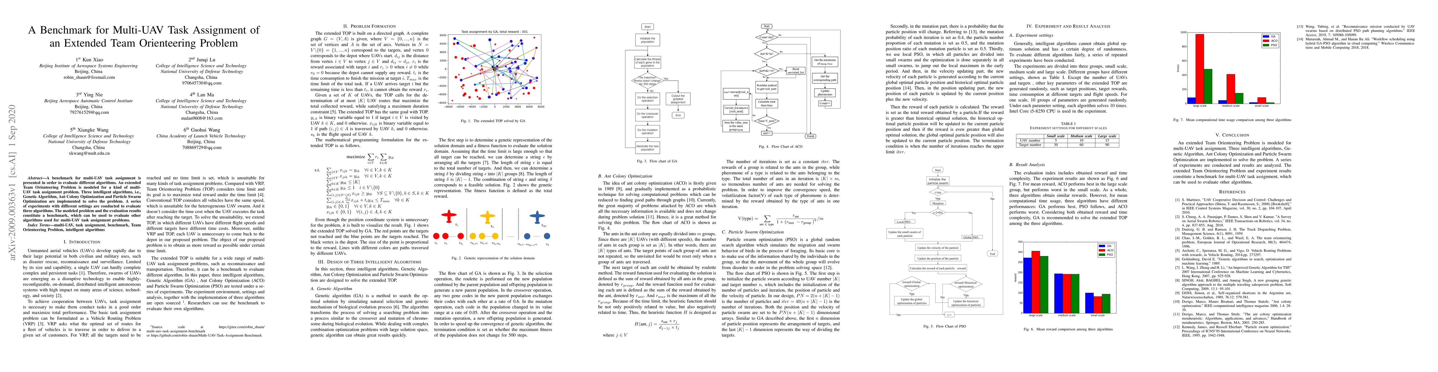This paper presents a benchmark for evaluating multi-UAV task assignment algorithms based on an extended Team Orienteering Problem. It implements Genetic Algorithm, Ant Colony Optimization, and Particle Swarm Optimization to solve the problem, and conducts a series of experiments to evaluate these algorithms, providing a comprehensive benchmark for future research.