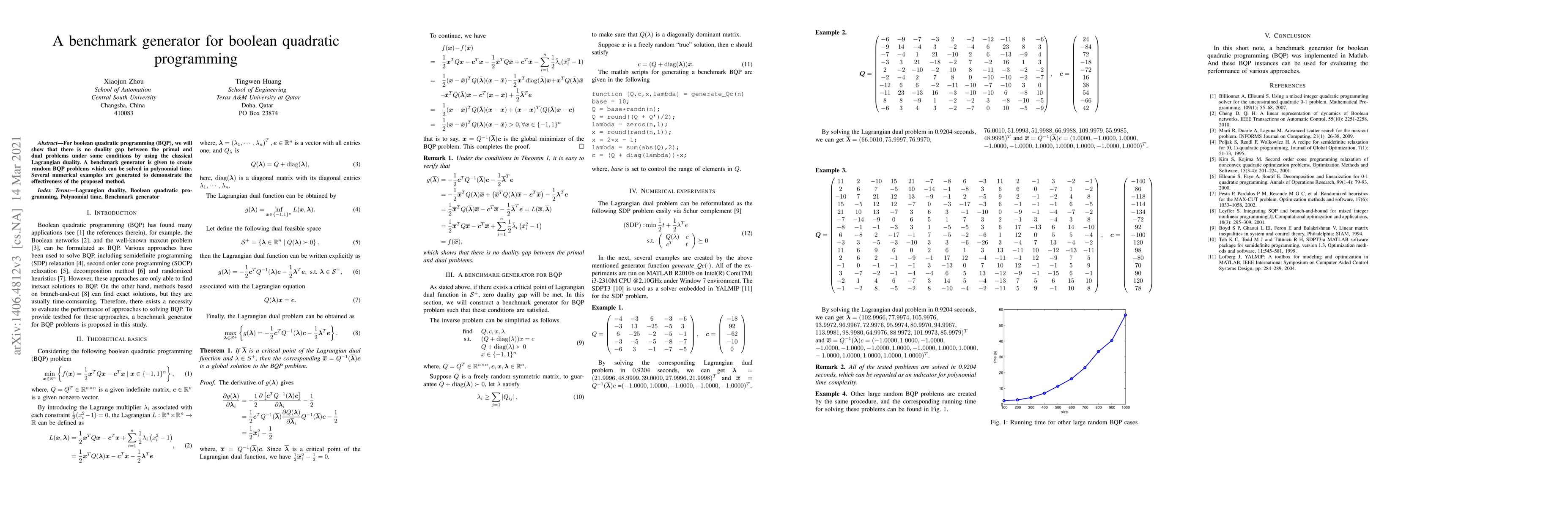 This paper presents a method to eliminate the duality gap in boolean quadratic programming (BQP) under certain conditions using classical Lagrangian duality. It also introduces a benchmark generator to create random BQP problems solvable in polynomial time, validated through numerical examples.
