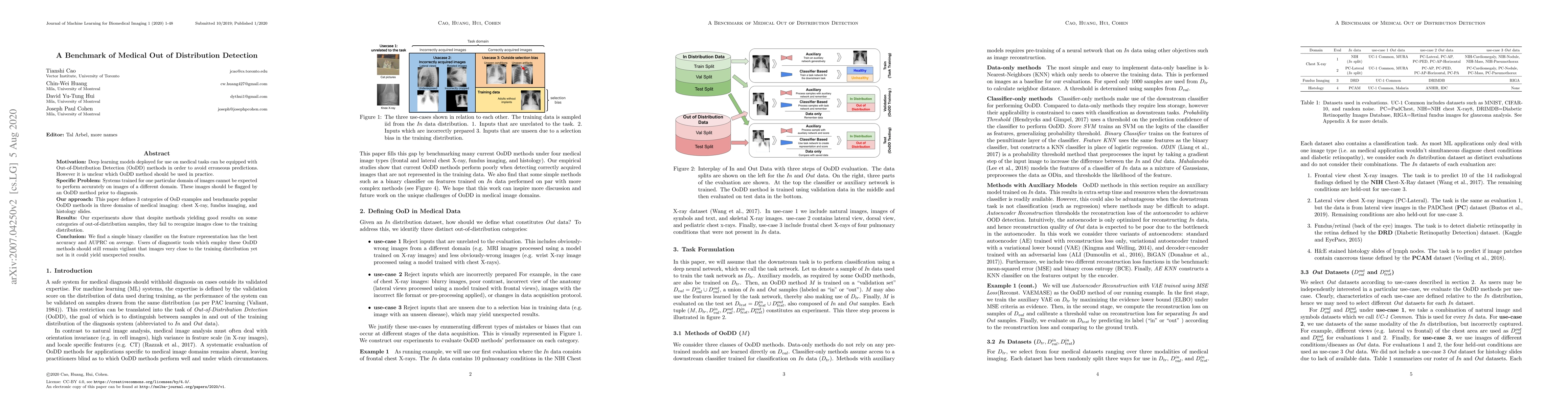 Researchers benchmarked popular Out-of-Distribution Detection methods for medical images in three domains, finding a simple binary classifier outperformed others.