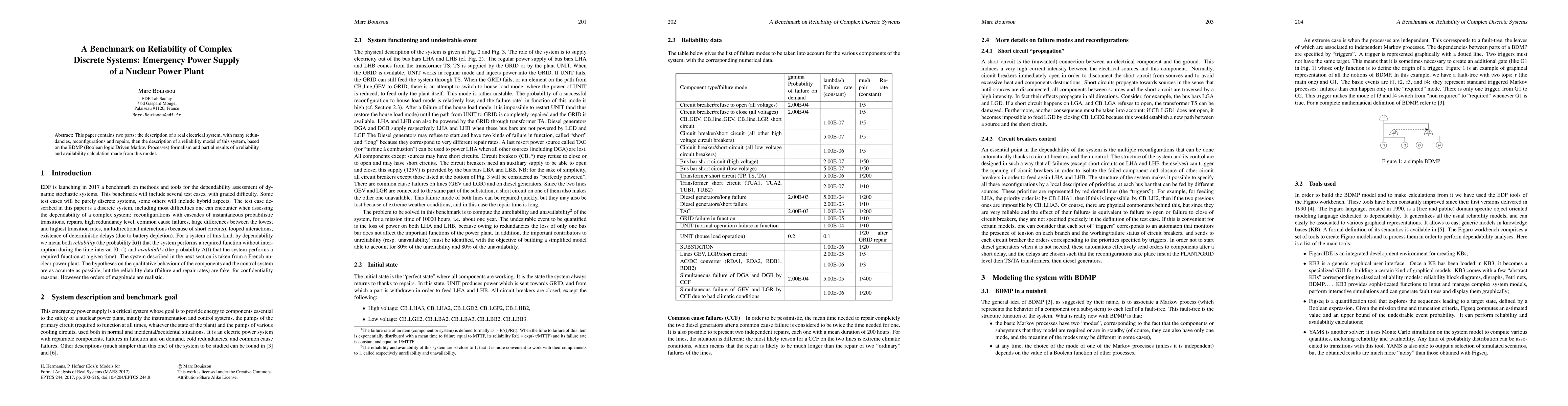 This paper contains two parts: the description of a real electrical system, with many redundancies, reconfigurations and repairs, then the description of a reliability model of this system, based on the BDMP (Boolean logic Driven Markov Processes) formalism and partial results of a reliability and availability calculation made from this model.