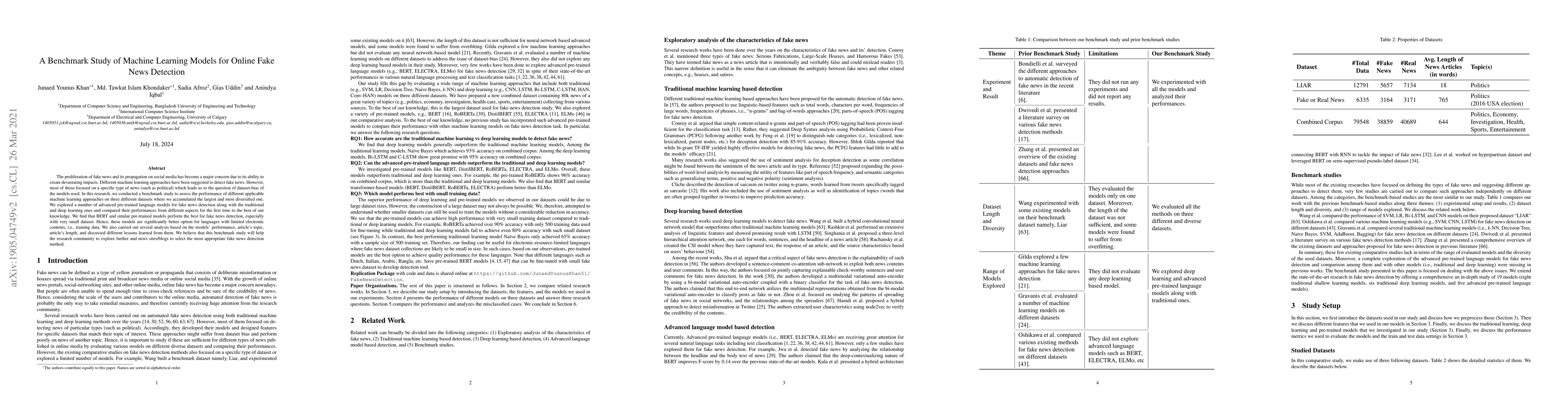 This study benchmarks various machine learning models for detecting online fake news across three diverse datasets, finding that pre-trained models like BERT perform best, especially with limited data, thus offering a valuable resource for languages with scarce training resources. The research also analyzes model performance based on factors like article topic and length.