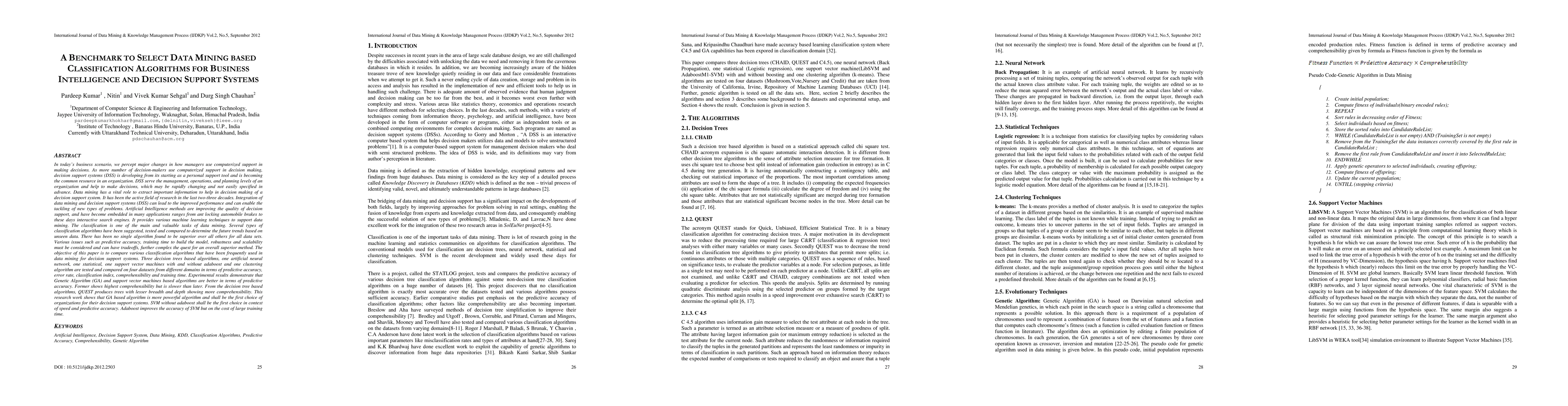 This paper benchmarks various classification algorithms for data mining in decision support systems, comparing decision trees, artificial neural networks, statistical methods, support vector machines, and clustering. Experimental results show that Genetic Algorithm and SVM-based methods excel in predictive accuracy, with SVM without adaboost offering a good balance of speed and accuracy, while adaboost enhances accuracy at the expense of training time.