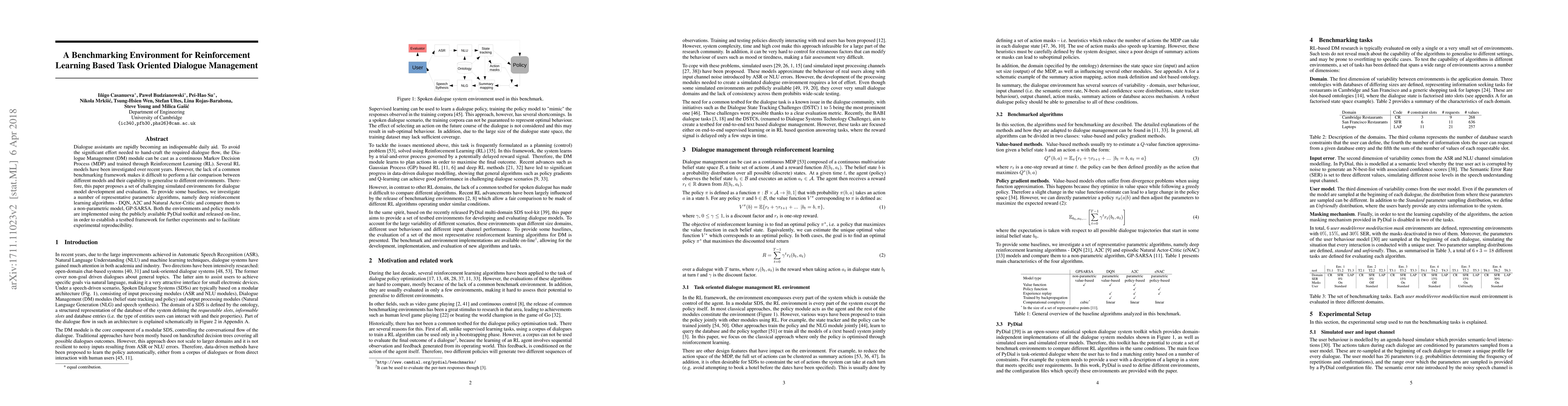 This paper introduces a benchmarking environment for evaluating reinforcement learning models in dialogue management, proposing simulated environments to facilitate fair comparisons. It also compares several deep RL algorithms and a non-parametric model, all implemented in the PyDial toolkit, to establish a reproducible testbed.