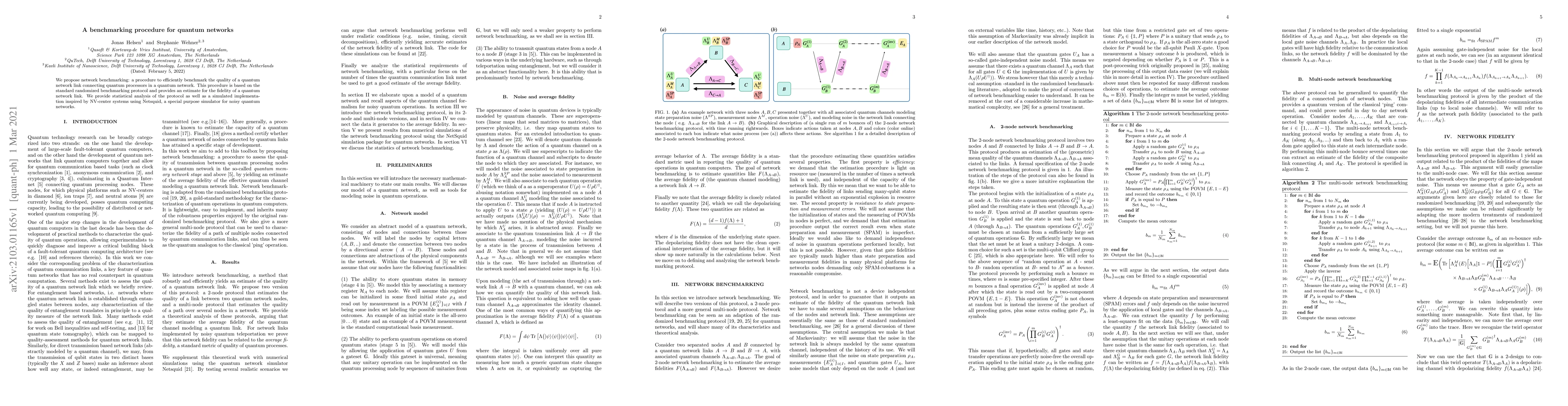 This paper introduces a benchmarking procedure for assessing the quality of quantum network links, based on randomized benchmarking, and provides statistical analysis and a simulated implementation using NV-center systems and the Netsquid simulator. The method estimates the fidelity of quantum network connections.