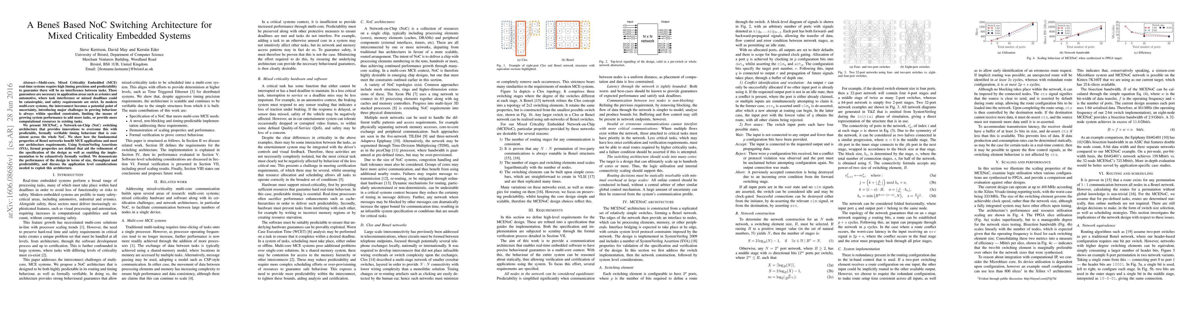 This paper introduces MCENoC, a Benes-based Network-on-Chip (NoC) switching architecture for mixed criticality embedded systems, ensuring high timing precision and predictability to prevent task interference in critical applications like avionics and automotive. The architecture leverages formal verification techniques to guarantee consistent timing behavior across the NoC, enhancing system performance and safety.