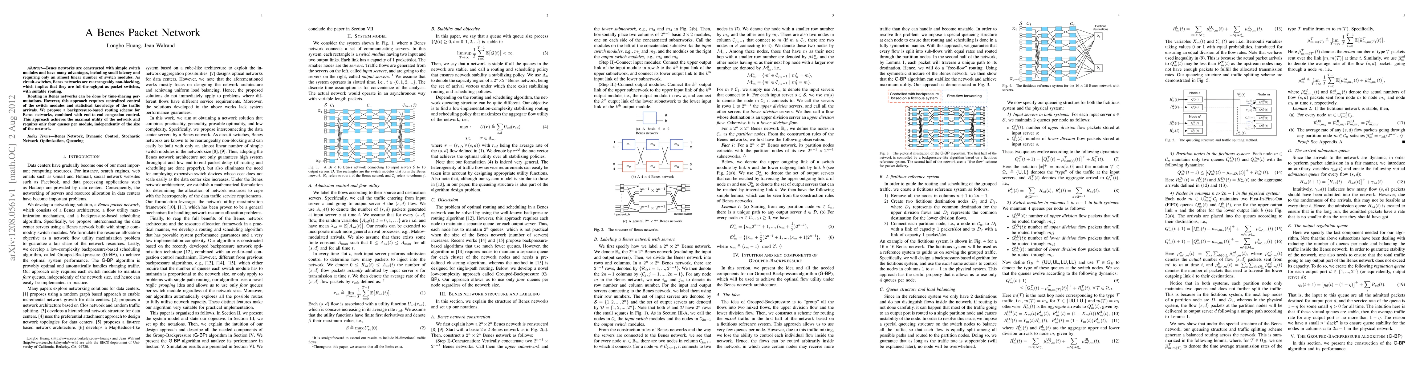This paper proposes a backpressure-based routing scheme for Benes packet networks, which achieves maximal network utility and requires minimal control infrastructure, utilizing only four queues per switch module regardless of network size. The scheme combines with end-to-end congestion control to maintain full throughput and low latency.