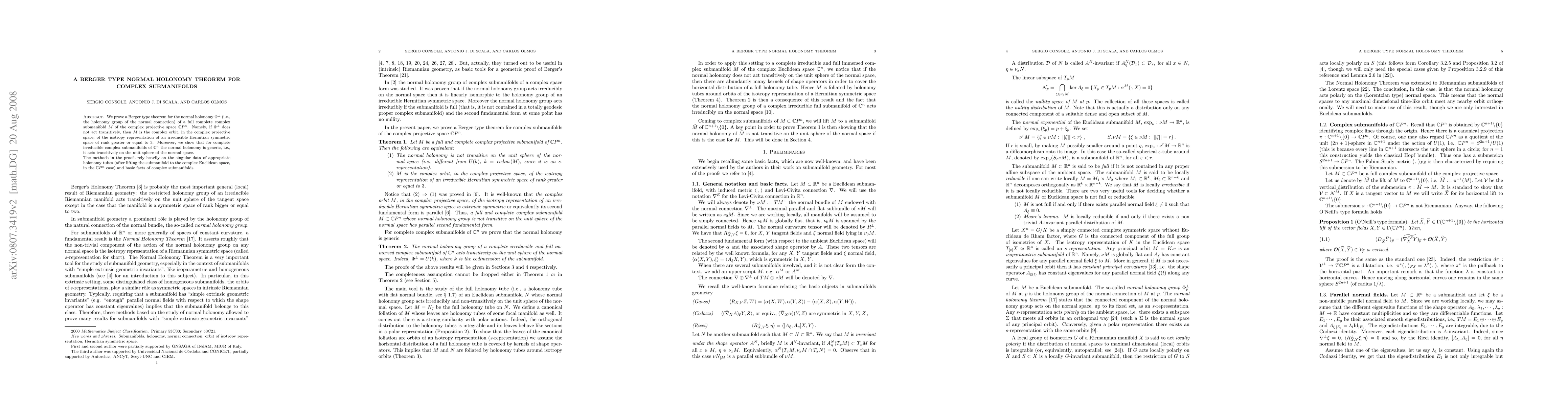Researchers prove that for complex submanifolds of the complex projective space, non-transitive normal holonomy groups correspond to specific types of Hermitian symmetric spaces, while complete irreducible submanifolds have generic, transitive normal holonomy in Euclidean space.