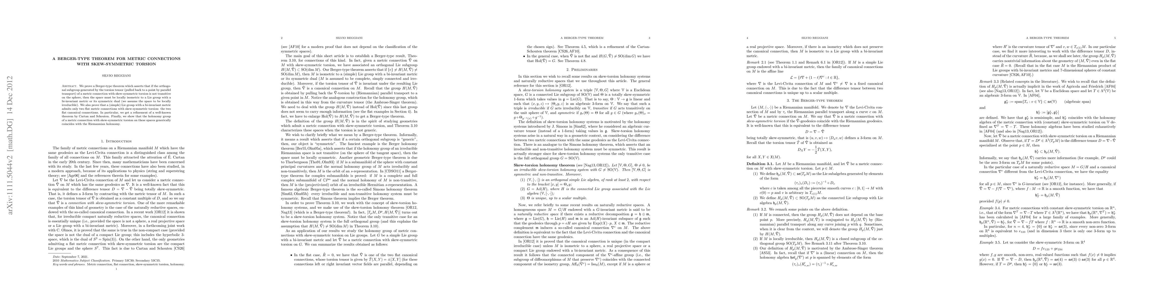 The paper proves a Berger-type theorem for metric connections with skew-symmetric torsion, utilizing concepts from differential geometry and Lie group theory.