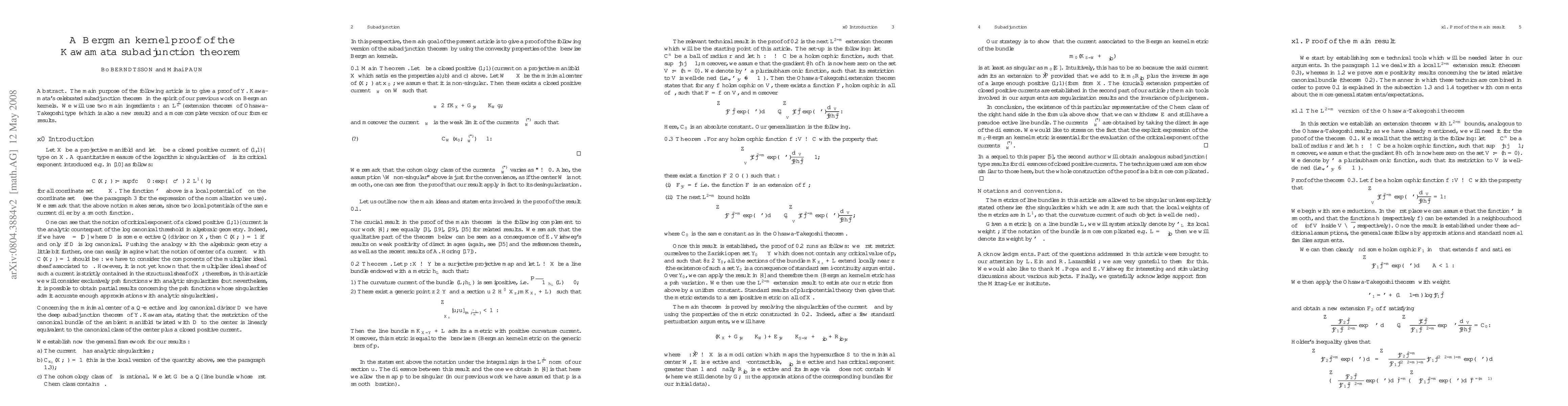 The main purpose of the following article is to give a proof of Y. Kawamata's celebrated subadjunction theorem in the spirit of our previous work on Bergman kernels. We will use two main ingredients : an $\displaystyle L^{2\over m}$--extension theorem of Ohsawa-Takegoshi type (which is also a new result) and a more complete version of our former results.