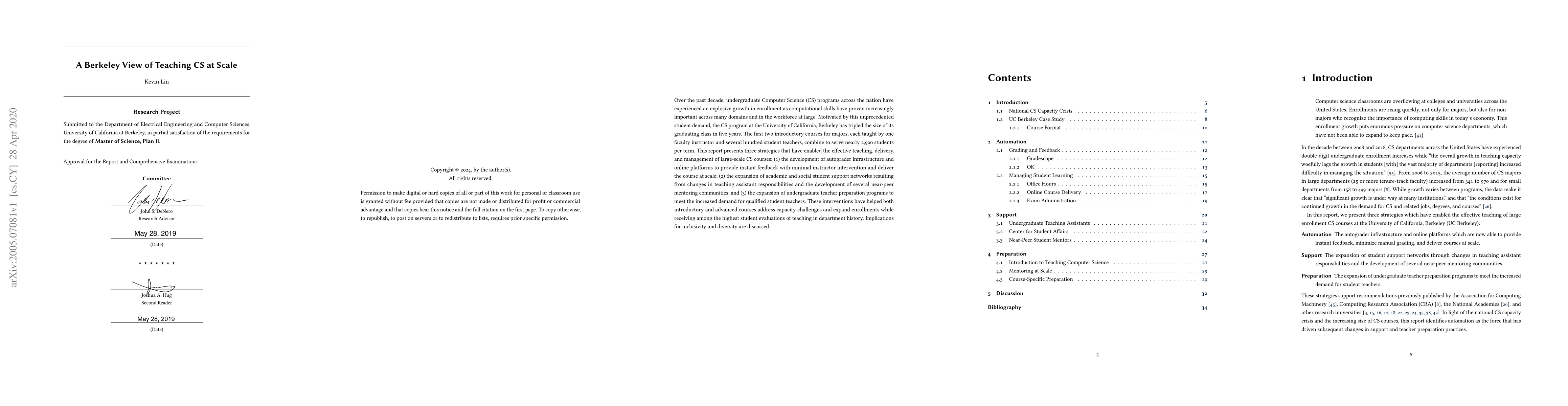 The University of California, Berkeley CS program has successfully scaled its teaching to 2,900 students per term using three strategies: autograder infrastructure, expanded student support networks, and undergraduate teacher preparation programs. These interventions have helped address capacity challenges while receiving high student evaluations.