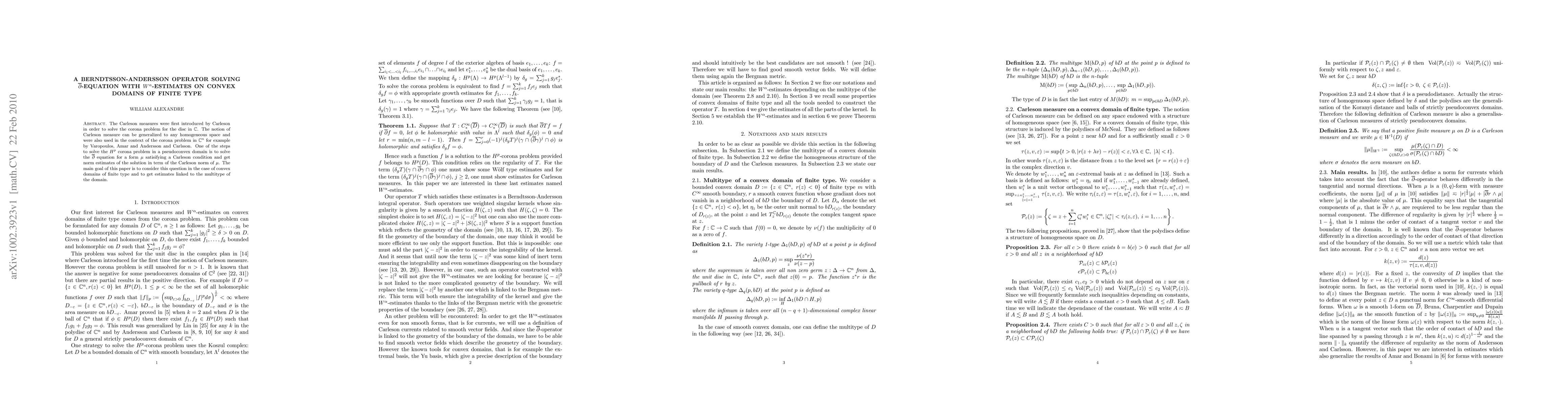 Summary: This paper employs a Berndtsson-Andersson operator and the Bergman metric to solve the $\bar\partial$ equation in convex domains of finite type, achieving $W^\alpha$ estimates for solutions satisfying a Carleson condition.
