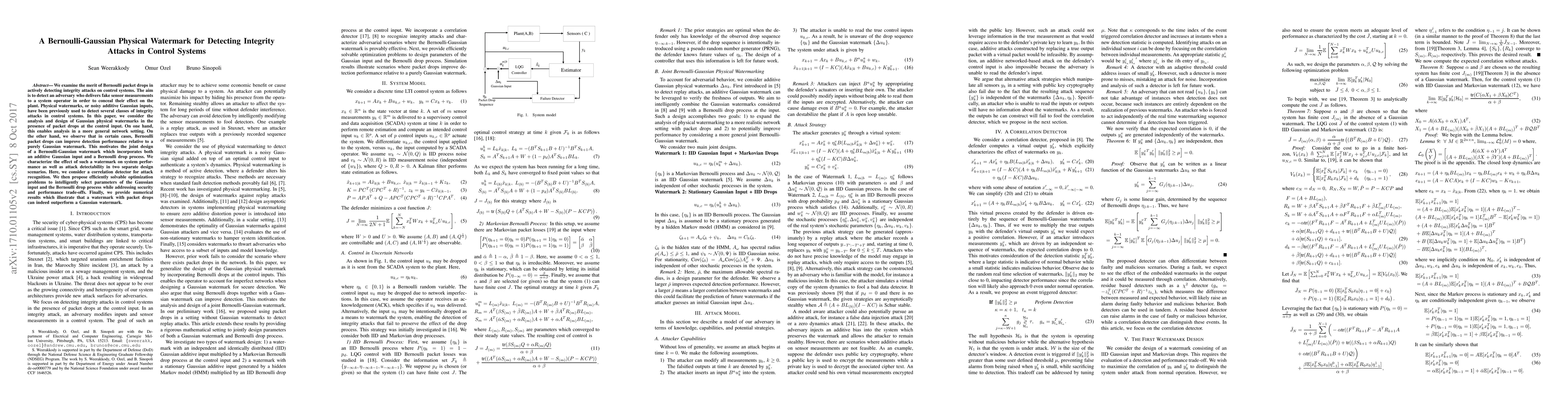 This paper explores the use of Bernoulli packet drops combined with Gaussian physical watermarks to enhance the detection of integrity attacks in control systems. The joint Bernoulli-Gaussian watermark design aims to improve detection performance over traditional Gaussian watermarks, offering a more robust solution in network settings with packet loss.