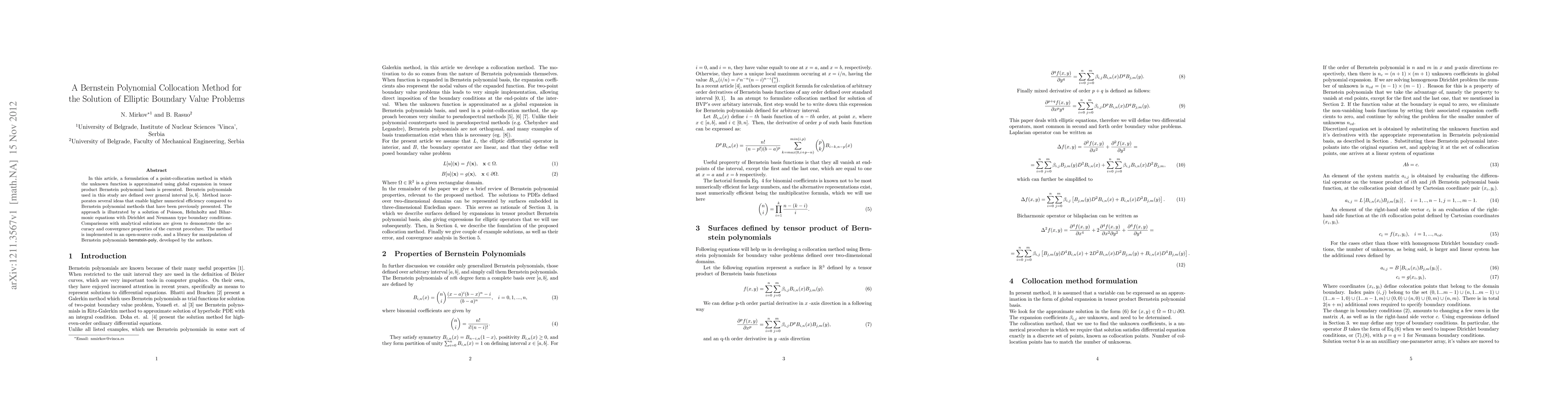 In this article, a formulation of a point-collocation method in which the unknown function is approximated using global expansion in tensor product Bernstein polynomial basis is presented. Bernstein polynomials used in this study are defined over general interval [a,b]. Method incorporates several ideas that enable higher numerical efficiency compared to Bernstein polynomial methods that have been previously presented. The approach is illustrated by a solution of Poisson, Helmholtz and Biharmonic equations with Dirichlet and Neumann type boundary conditions. Comparisons with analytical solutions are given to demonstrate the accuracy and convergence properties of the current procedure. The method is implemented in an open-source code, and a library for manipulation of Bernstein polynomials bernstein-poly, developed by the authors.