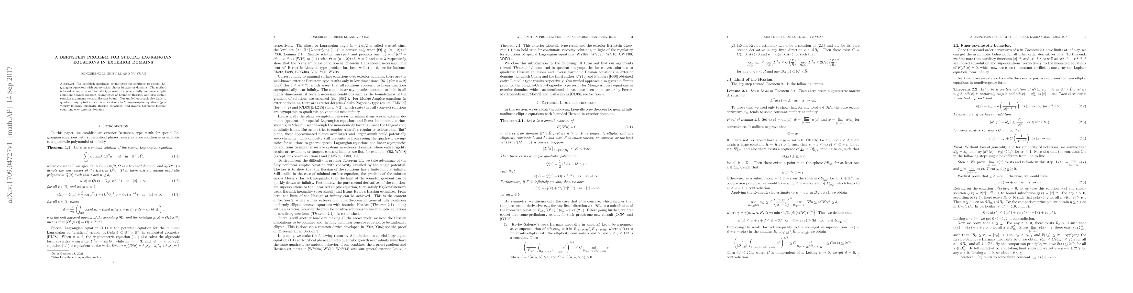 This paper establishes quadratic asymptotics for solutions to special Lagrangian equations in exterior domains, leveraging an exterior Liouville result and rotation arguments. The approach also extends to provide similar asymptotics for convex solutions to Monge-Ampère, quadratic Hessian, and inverse harmonic Hessian equations in exterior domains.