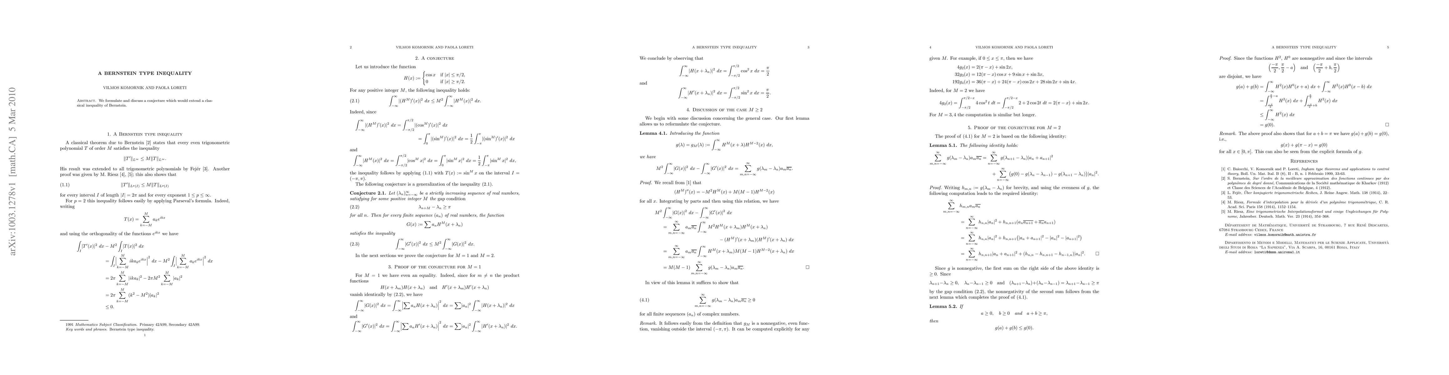Summary: This paper proposes a conjecture extending the classical Bernstein inequality, aiming to broaden its applicability and significance in mathematical analysis. The conjecture's implications and potential proofs are discussed in detail.