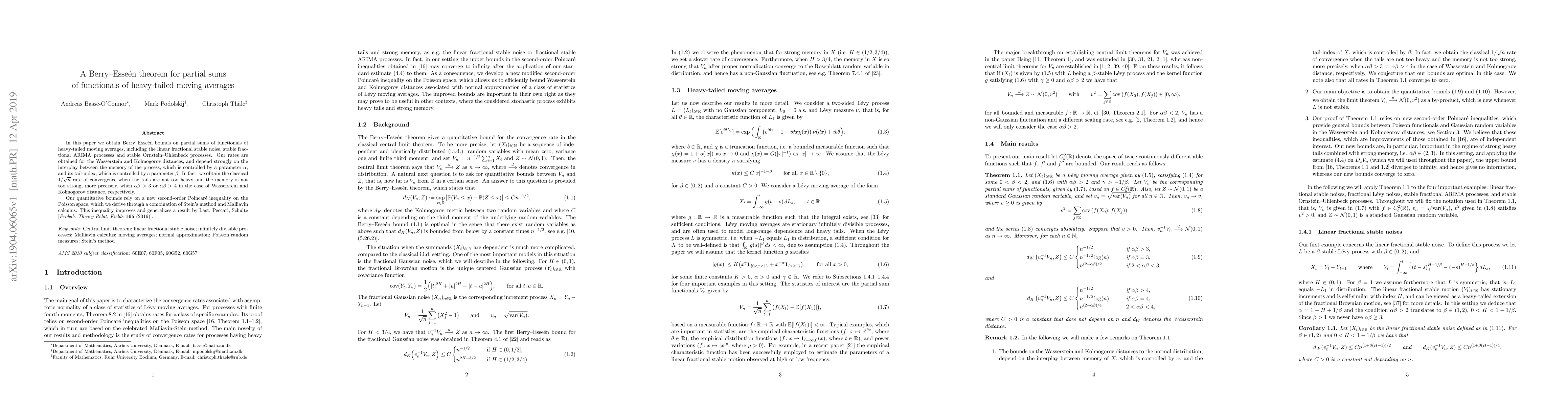 In this paper we obtain Berry-Esse\'en bounds on partial sums of functionals of heavy-tailed moving averages, including the linear fractional stable noise, stable fractional ARIMA processes and stable Ornstein-Uhlenbeck processes. Our rates are obtained for the Wasserstein and Kolmogorov distances, and depend strongly on the interplay between the memory of the process, which is controlled by a parameter $\alpha$, and its tail-index, which is controlled by a parameter $\beta$. In fact, we obtain the classical $\sqrt{1/ n}$ rate of convergence when the tails are not too heavy and the memory is not too strong, more precisely, when $\alpha\beta > 3$ or $\alpha\beta > 4$ in the case of Wasserstein and Kolmogorov distance, respectively. Our quantitative bounds rely on a new second-order Poincare inequality on the Poisson space, which we derive through a combination of Stein's method and Malliavin calculus. This inequality improves and generalizes a result by Last, Peccati, Schulte [Probab. Theory Relat. Fields 165 (2016)].