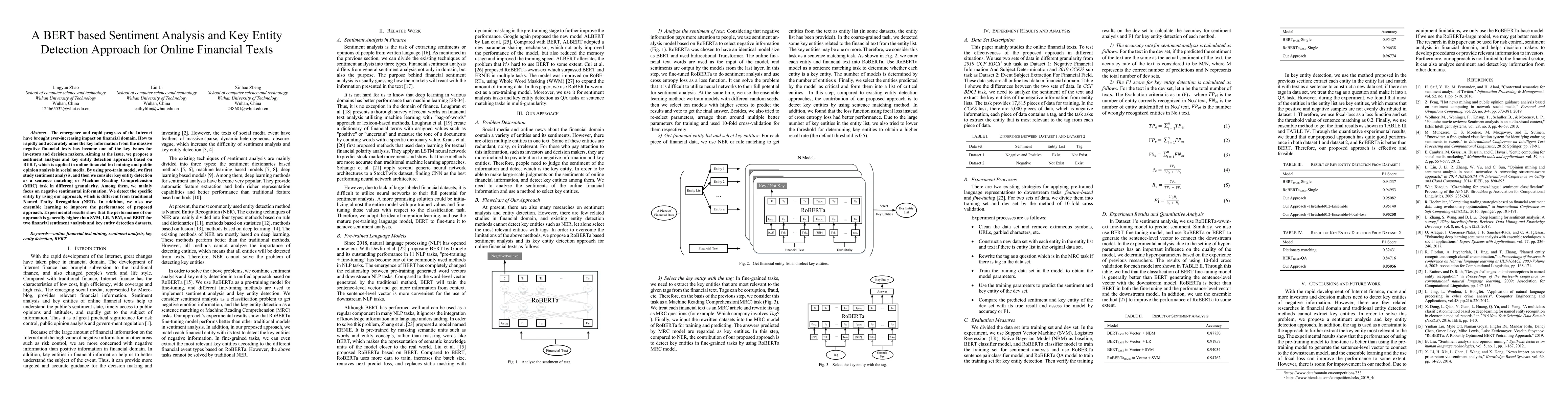 This paper proposes a BERT-based approach for sentiment analysis and key entity detection in online financial texts, focusing on negative sentiment and specific entities. The method uses ensemble learning to enhance performance, outperforming traditional models like SVM, LR, NBM, and BERT on financial sentiment analysis and key entity detection tasks.