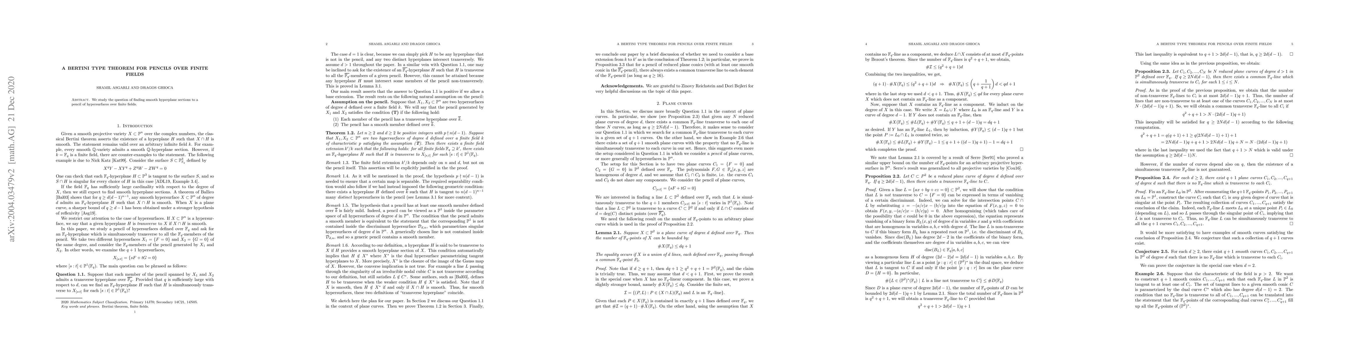 Summary: This paper investigates a Bertini type theorem concerning the existence of smooth hyperplane sections for a pencil of hypersurfaces over finite fields, providing insights into geometric properties in this context.