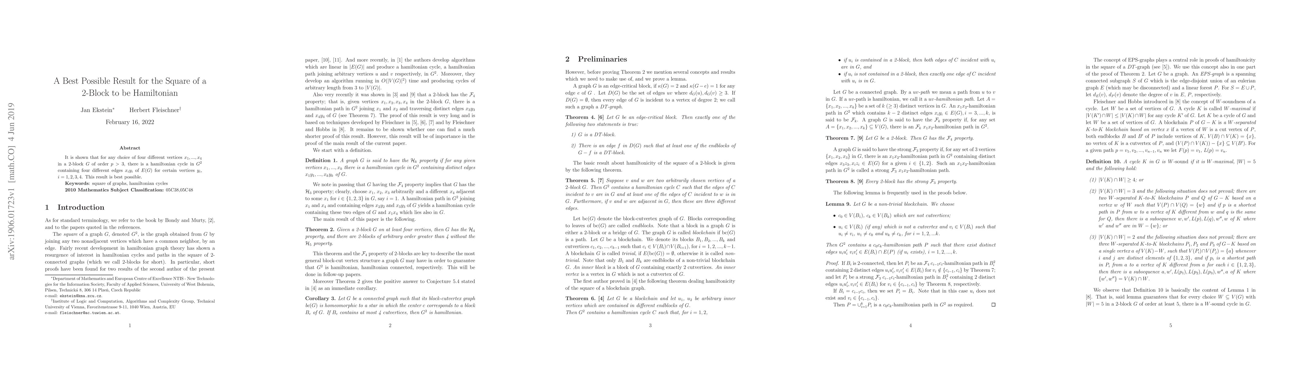 It is shown that for any choice of four different vertices x_1,...,x_4 in a 2-block G of order p>3, there is a hamiltonian cycle in G^2 containing four different edges x_iy_i of E(G) for certain vertices y_i, i=1,2,3,4. This result is best possible.