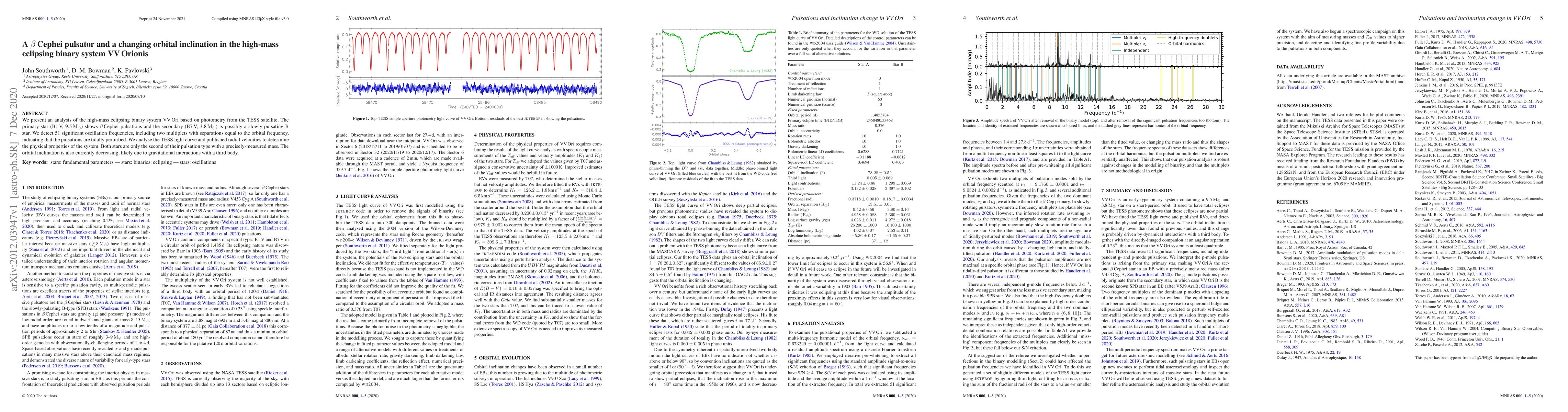 This study analyzes the high-mass eclipsing binary system VV Ori, revealing the primary star's beta Cephei pulsations and the secondary's possible slow pulsations. The system's orbital inclination is decreasing, likely due to gravitational interactions with a third body.