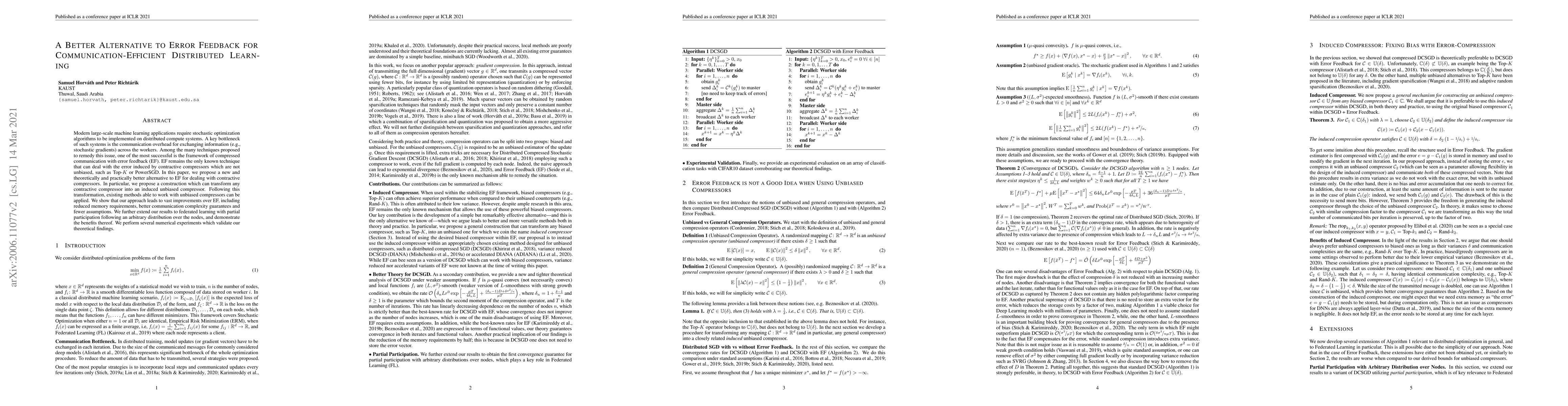 This paper proposes a novel alternative to error feedback (EF) for communication-efficient distributed learning, transforming contractive compressors into unbiased ones, leading to improved memory and communication efficiency. The method also extends to federated learning scenarios with partial participation.