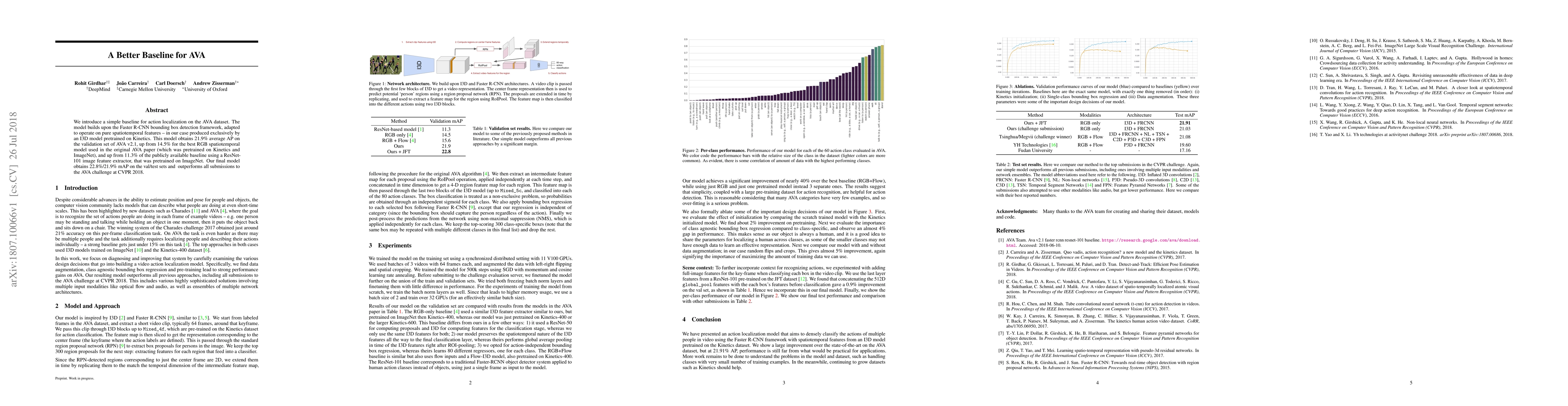 We introduce a simple baseline for action localization on the AVA dataset. The model builds upon the Faster R-CNN bounding box detection framework, adapted to operate on pure spatiotemporal features - in our case produced exclusively by an I3D model pretrained on Kinetics. This model obtains 21.9% average AP on the validation set of AVA v2.1, up from 14.5% for the best RGB spatiotemporal model used in the original AVA paper (which was pretrained on Kinetics and ImageNet), and up from 11.3 of the publicly available baseline using a ResNet101 image feature extractor, that was pretrained on ImageNet. Our final model obtains 22.8%/21.9% mAP on the val/test sets and outperforms all submissions to the AVA challenge at CVPR 2018.