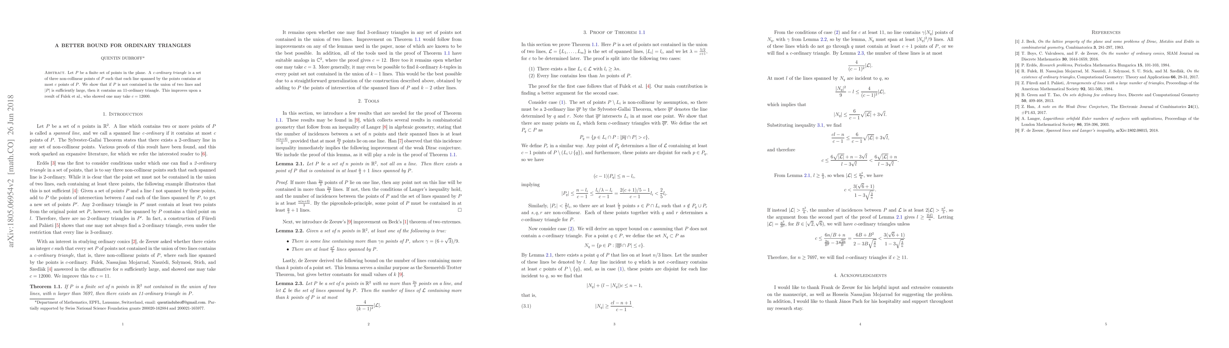 Let $P$ be a finite set of points in the plane. A c-ordinary triangle is a set of three non-collinear points of $P$ such that each line spanned by the points contains at most $c$ points of $P$. We show that if $P$ is not contained in the union of two lines and $|P|$ is sufficiently large, then it contains an 11-ordinary triangle. This improves upon a result of Fulek et al., who showed one may take $c=12000$.