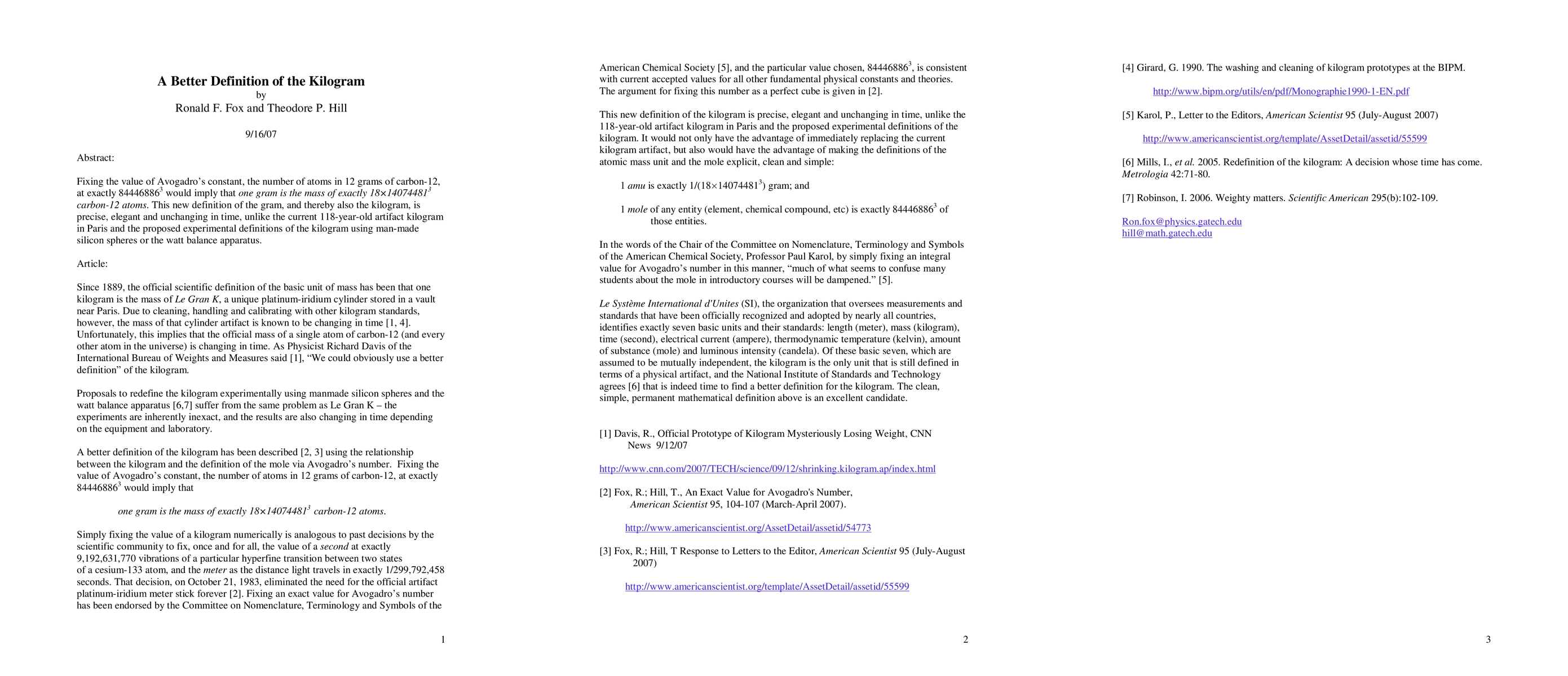 Fixing the value of Avogadro's constant, the number of atoms in 12 grams of carbon-12, at exactly 84446886^3 would imply that one gram is the mass of exactly 18x14074481^3 carbon-12 atoms. This new definition of the gram, and thereby also the kilogram, is precise, elegant and unchanging in time, unlike the current 118-year-old artifact kilogram in Paris and the proposed experimental definitions of the kilogram using man-made silicon spheres or the watt balance apparatus.