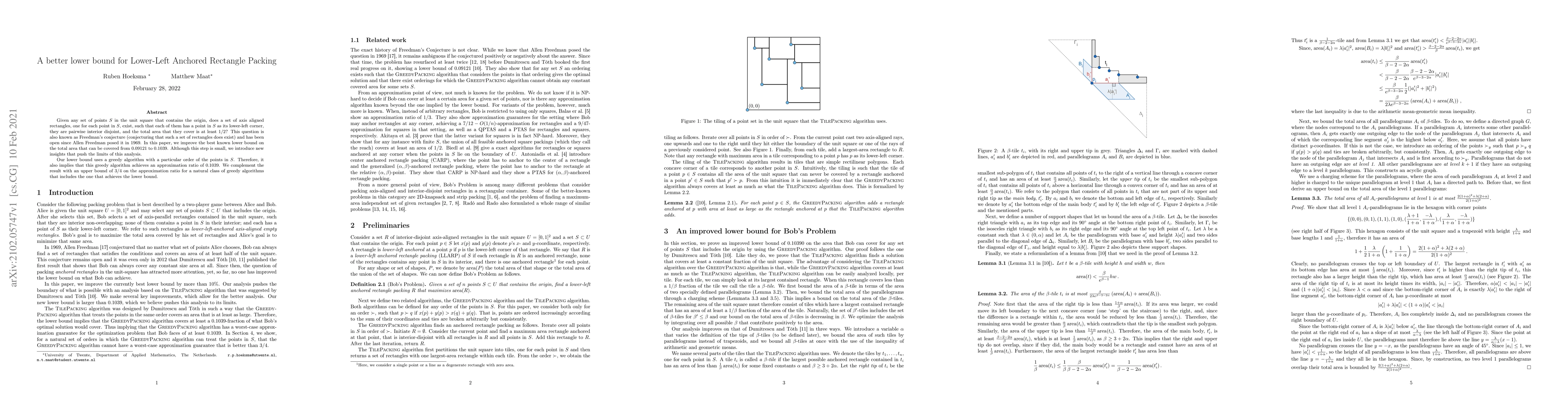 Given any set of points $S$ in the unit square that contains the origin, does a set of axis aligned rectangles, one for each point in $S$, exist, such that each of them has a point in $S$ as its lower-left corner, they are pairwise interior disjoint, and the total area that they cover is at least 1/2? This question is also known as Freedman's conjecture (conjecturing that such a set of rectangles does exist) and has been open since Allen Freedman posed it in 1969. In this paper, we improve the best known lower bound on the total area that can be covered from 0.09121 to 0.1039. Although this step is small, we introduce new insights that push the limits of this analysis. Our lower bound uses a greedy algorithm with a particular order of the points in $S$. Therefore, it also implies that this greedy algorithm achieves an approximation ratio of 0.1039. We complement the result with an upper bound of 3/4 on the approximation ratio for a natural class of greedy algorithms that includes the one that achieves the lower bound.
