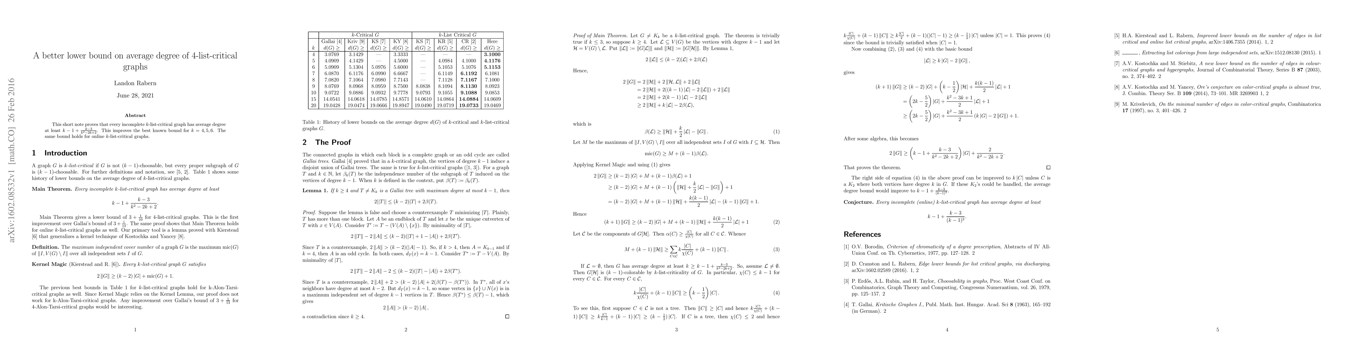 A new bound on average degree for 4-list-critical graphs shows that incomplete graphs have at least $k-1 + rac{k-3}{k^2-2k+2}$ degrees.