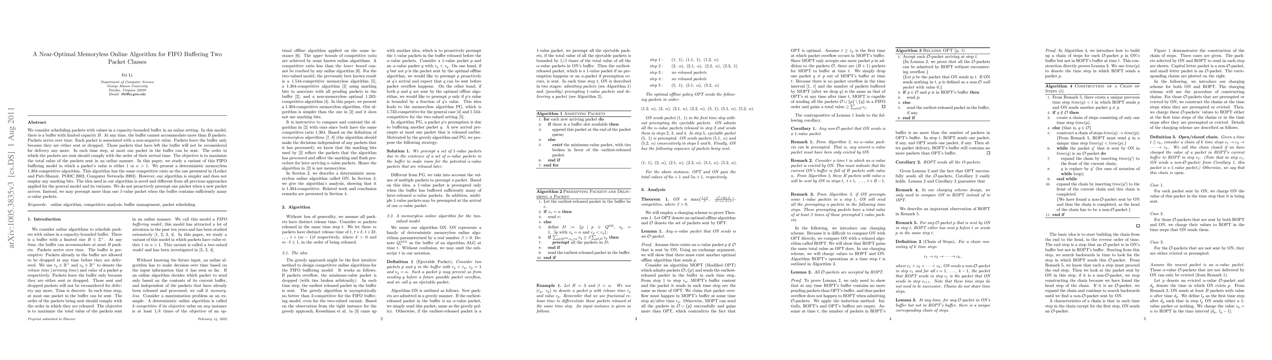 We consider scheduling packets with values in a capacity-bounded buffer in an online setting. In this model, there is a buffer with limited capacity $B$. At any time, the buffer cannot accommodate more than $B$ packets. Packets arrive over time. Each packet is associated with a non-negative value. Packets leave the buffer only because they are either sent or dropped. Those packets that have left the buffer will not be reconsidered for delivery any more. In each time step, at most one packet in the buffer can be sent. The order in which the packets are sent should comply with the order of their arrival time. The objective is to maximize the total value of the packets sent in an online manner. In this paper, we study a variant of this FIFO buffering model in which a packet's value is either 1 or $\alpha > 1$. We present a deterministic memoryless 1.304-competitive algorithm. This algorithm has the same competitive ratio as the one presented in (Lotker and Patt-Shamir. PODC 2002, Computer Networks 2003). However, our algorithm is simpler and does not employ any marking bits. The idea used in our algorithm is novel and different from all previous approaches applied for the general model and its variants. We do not proactively preempt one packet when a new packet arrives. Instead, we may preempt more than one 1-value packet when the buffer contains sufficiently many $\alpha$-value packets.