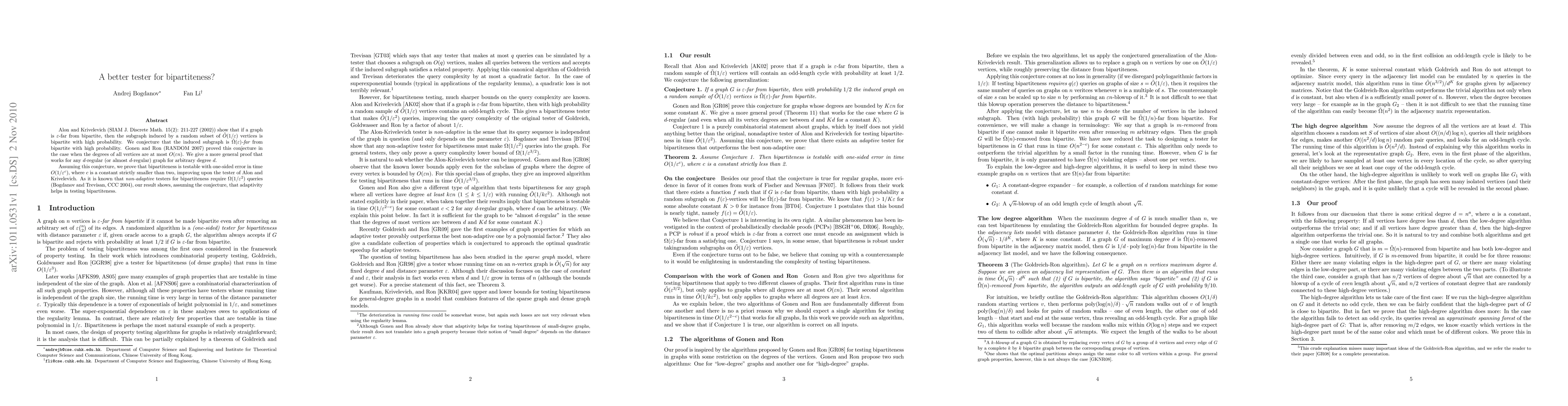 Alon and Krivelevich (SIAM J. Discrete Math. 15(2): 211-227 (2002)) show that if a graph is {\epsilon}-far from bipartite, then the subgraph induced by a random subset of O(1/{\epsilon}) vertices is bipartite with high probability. We conjecture that the induced subgraph is {\Omega}~({\epsilon})-far from bipartite with high probability. Gonen and Ron (RANDOM 2007) proved this conjecture in the case when the degrees of all vertices are at most O({\epsilon}n). We give a more general proof that works for any d-regular (or almost d-regular) graph for arbitrary degree d. Assuming this conjecture, we prove that bipartiteness is testable with one-sided error in time O(1/{\epsilon}^c), where c is a constant strictly smaller than two, improving upon the tester of Alon and Krivelevich. As it is known that non-adaptive testers for bipartiteness require {\Omega}(1/{\epsilon}^2) queries (Bogdanov and Trevisan, CCC 2004), our result shows, assuming the conjecture, that adaptivity helps in testing bipartiteness.